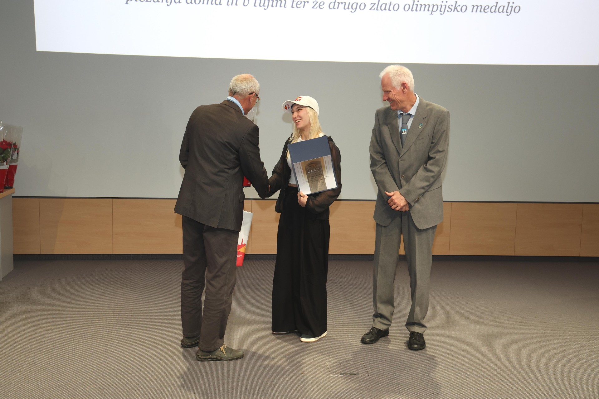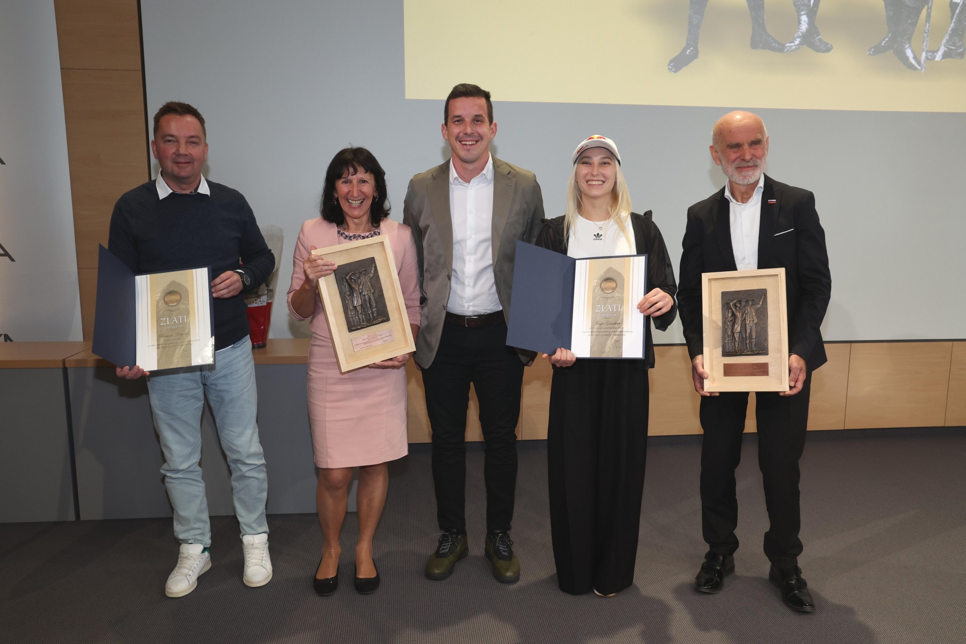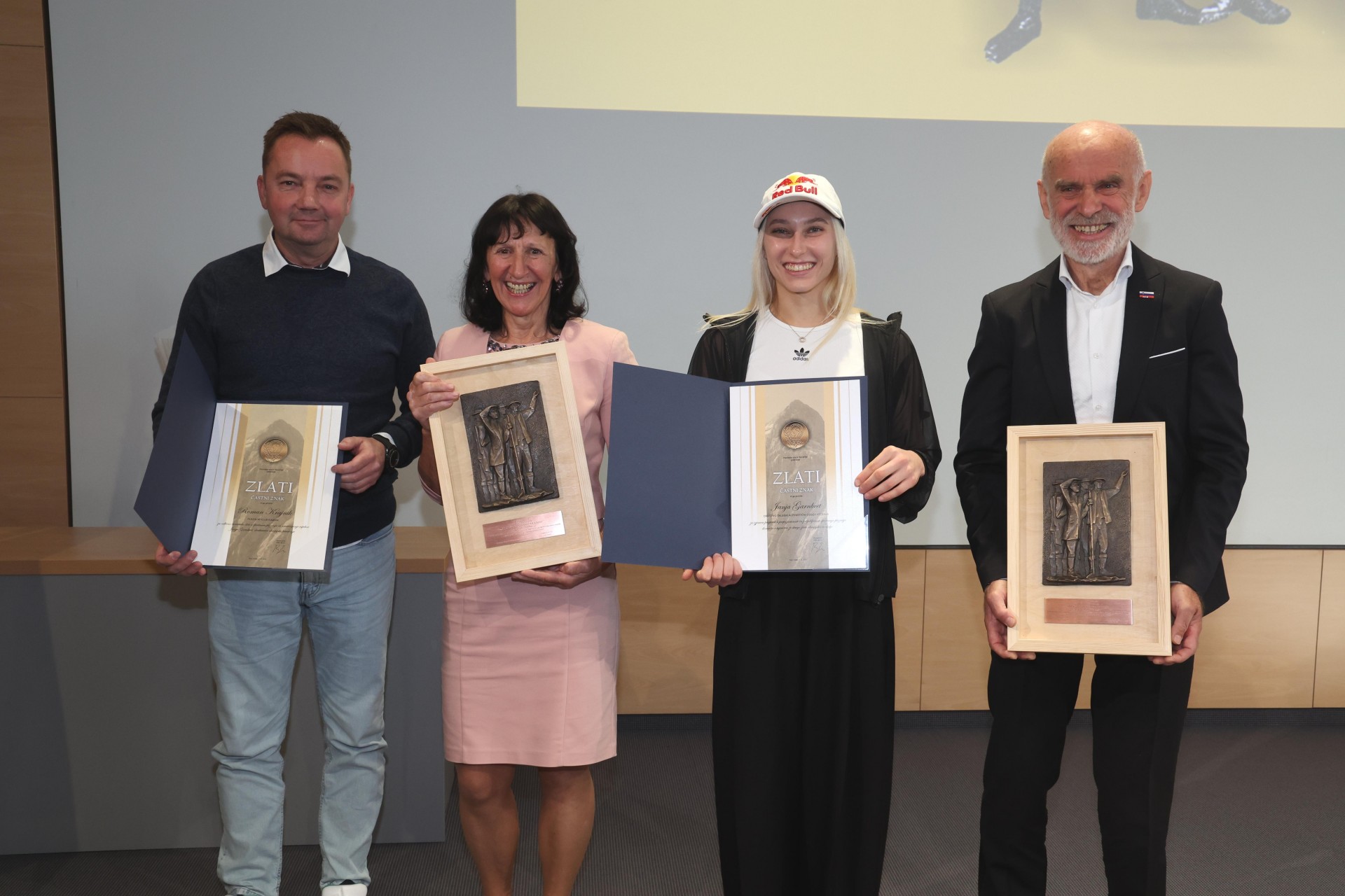 Zlati častni znak PZS sta prejela Janja Garnbret za izjemen prispevek k prepoznavnosti in priljubljenosti športnega plezanja doma in v tujini ter že drugo zlato olimpijsko medaljo, ter njen trener Roman Krajnik za odlično trenersko delo v športnem plezanju in soustvarjanje uspehov dvakratne olimpijske prvakinje. "Oba sva perfekcionista, vsak v svojo smer, kar dela zelo dober tim. Oba si tudi želiva zlato medaljo, ne zanima naju srebrna ali bronasta, zato tudi zlati častni znak. Dobro sodelujeva, dobro se razumeva, veliko je sklepanja kompromisov, pa tudi manjših nesoglasij, a vedno oba delava za isto stvar in sva složna," je o delovanju zlate naveze, ki jo je občinstvo nagradilo z gromkim aplavzom, spregovorila dvakratna olimpijska prvakinja, ki je priznala, da je dan prej še vedno jokala, ko je gledala posnetek svojega olimpijskega nastopa: "Olimpijsko medaljo iz Pariza še vedno doživljam zelo čustveno, ker vem, koliko sebe sem dala vanjo, zato je vedno, ko bodisi vidim sliko ali posnetek, zelo čustveno." Tokratno občinstvo je bilo malce drugačno kot sicer na njenih tekmah, a se je izkazalo, da so zelo goreči navijači: "Ta podpora mi ogromno pomeni. Ko poslušaš njihove zgodbe, so res navdihujoče in mi dajejo dodatno motivacijo in zagon. Počaščena sem, da sem v takšni družbi."