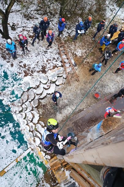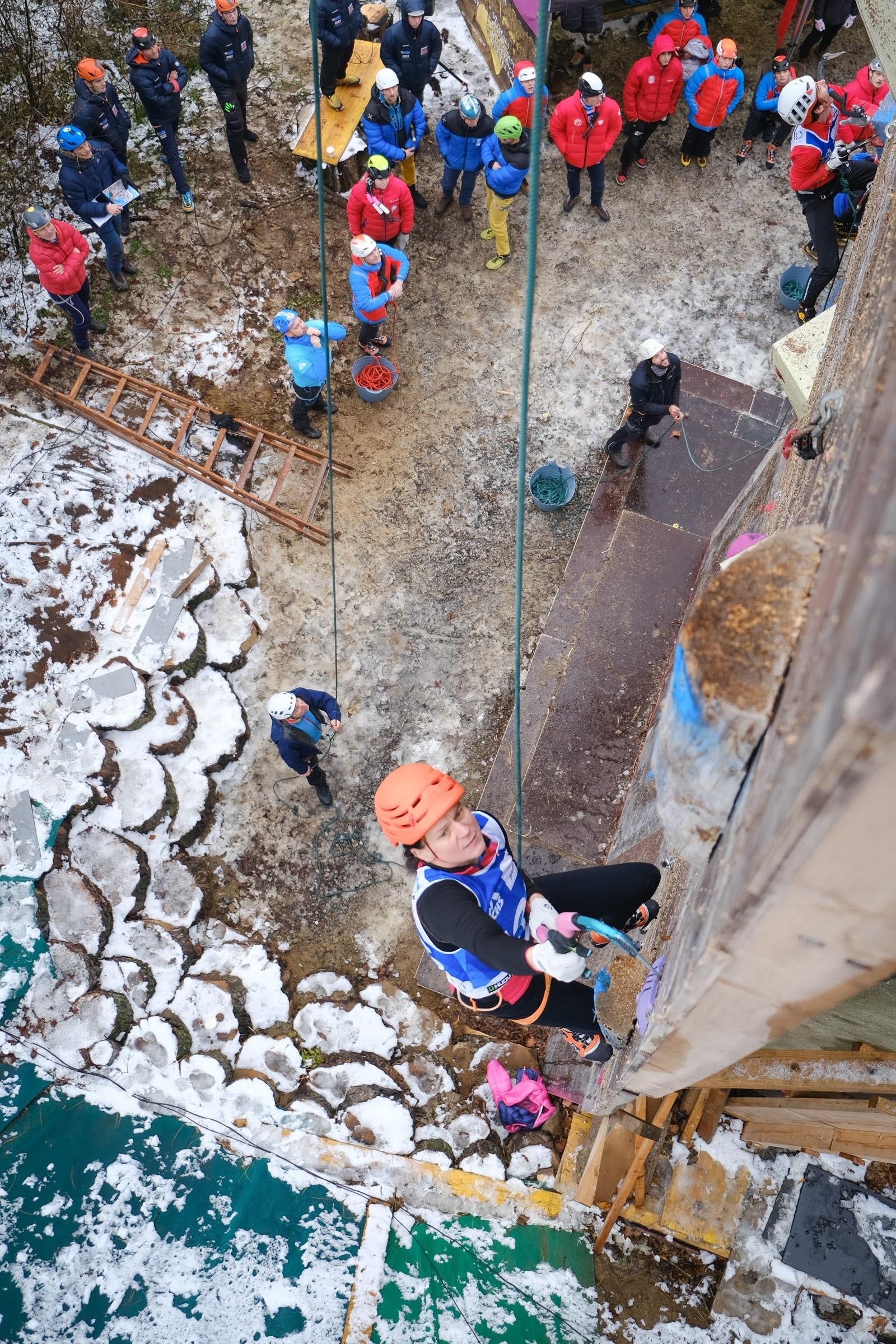 Gregor Šegel (s štartno številko 132) novi medalji naproti v Brnu na Češkem, kjer je steber nedokončanega mostu nacistične Nemčije danes prizorišče priljubljene tekme celinskega pokala v tekmovalnem lednem plezanju. (foto Marta Krejan Čokl)