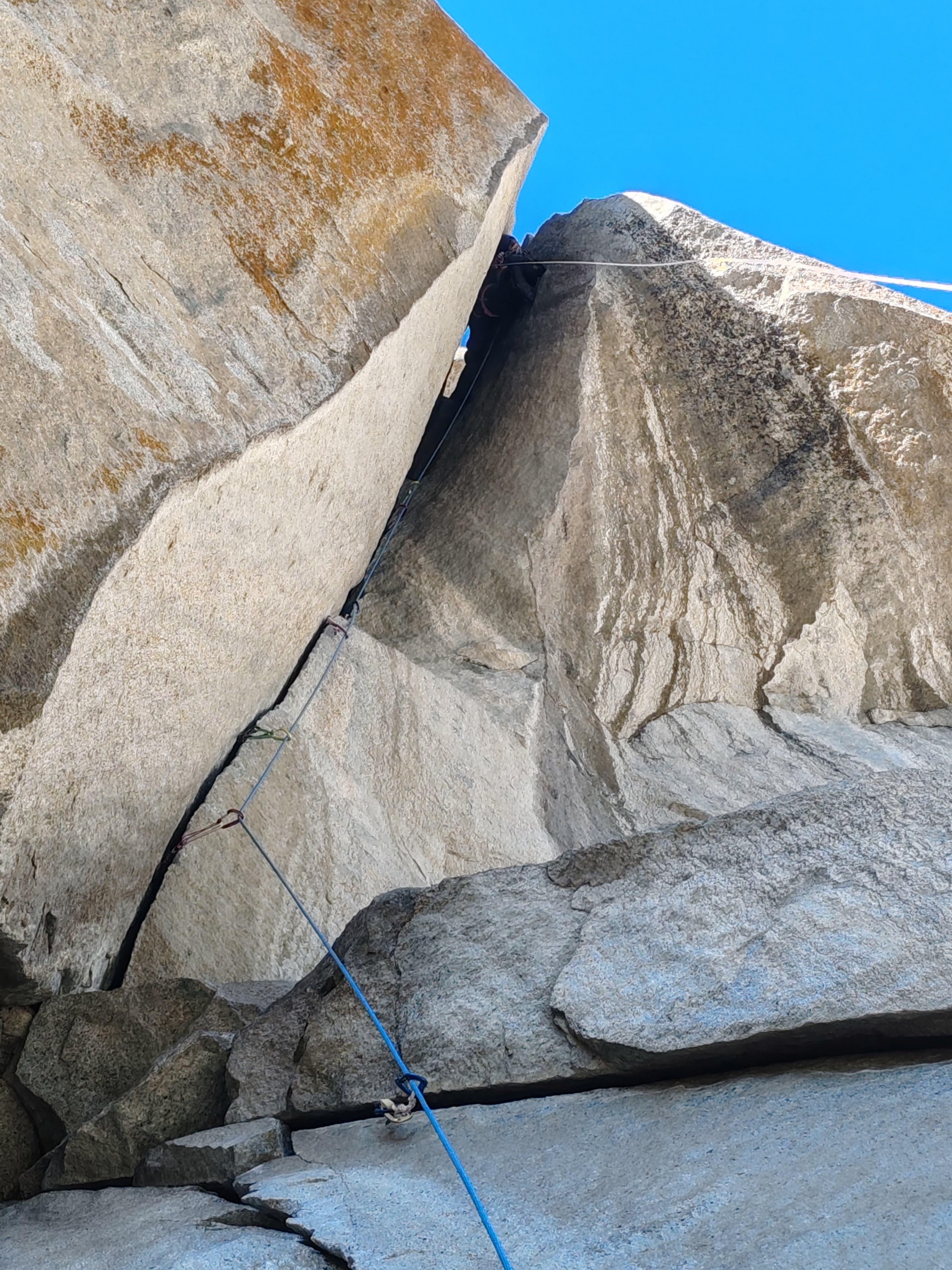 Drugi dan je sledilo žimarjenje (vzpenjanje po vrvi) 170 metrov, kolikor sta se prejšnji večer v temo spustila do baznega tabora, s sabo pa sta pritovorila še preostanek opreme, ki pa je tehtala vsaj 50 kilogramov, kar jima je vzelo veliko energije in časa. Zato sta naslednjih pet raztežajev odplezala po žgočem soncu, v delu smeri, ki je bil težji za orientacijo, skala slabše kakovosti, varovanje pa tudi ne najboljše. Kruder se je na pogled pregrizel čez detajl, nad njim padel, se spustil do sidrišča in ga preplezal v drugem poskusu. Med plezanjem celotne smeri je v steni padel le dvakrat, vse ostale raztežaje je preplezal v prvem poskusu.