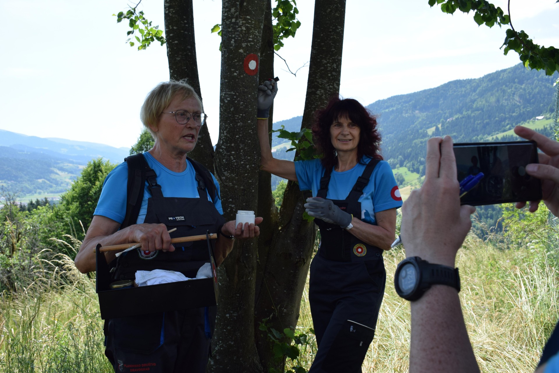 Markacistki PD Dravograd Ivana Kotnik in Brigita Skrube - usklajena naveza pri risanju Knafelčeve markacije, ki nas že 103 leta vodi po planinskih poteh. (foto Manca Ogrin)