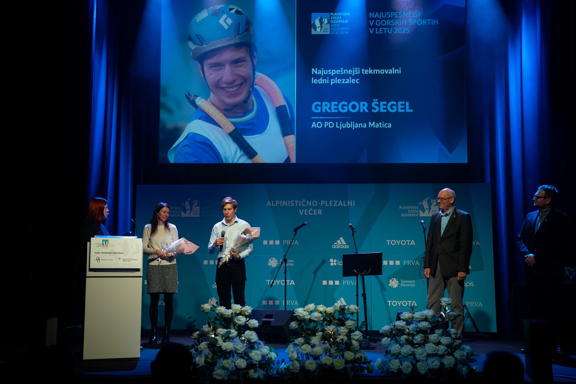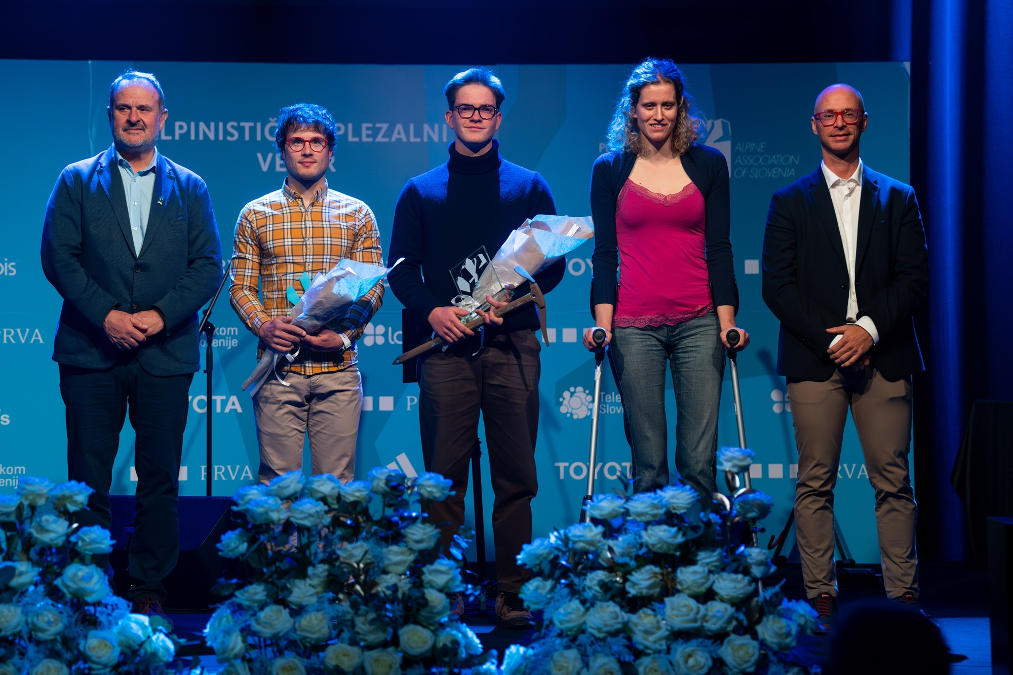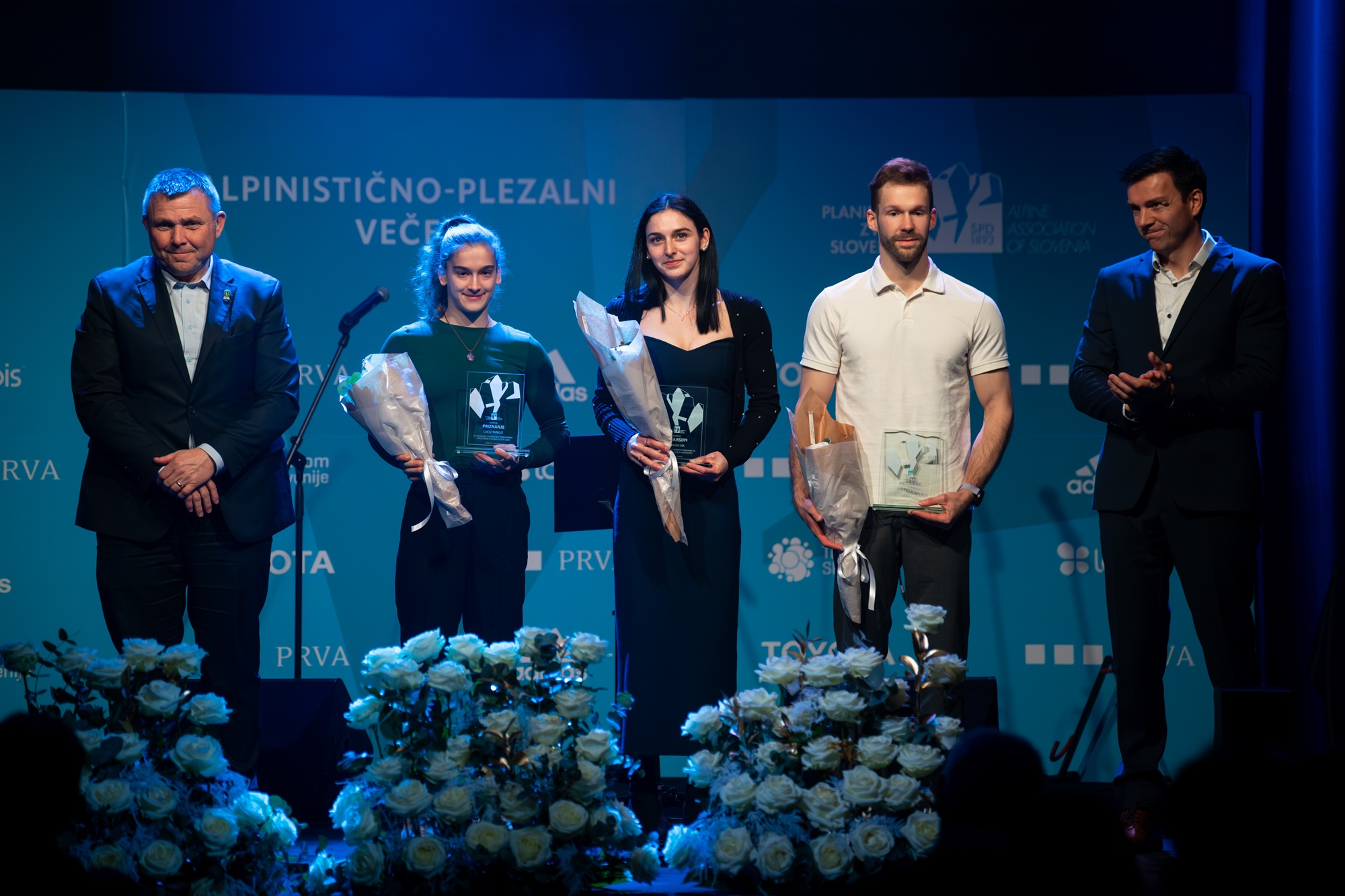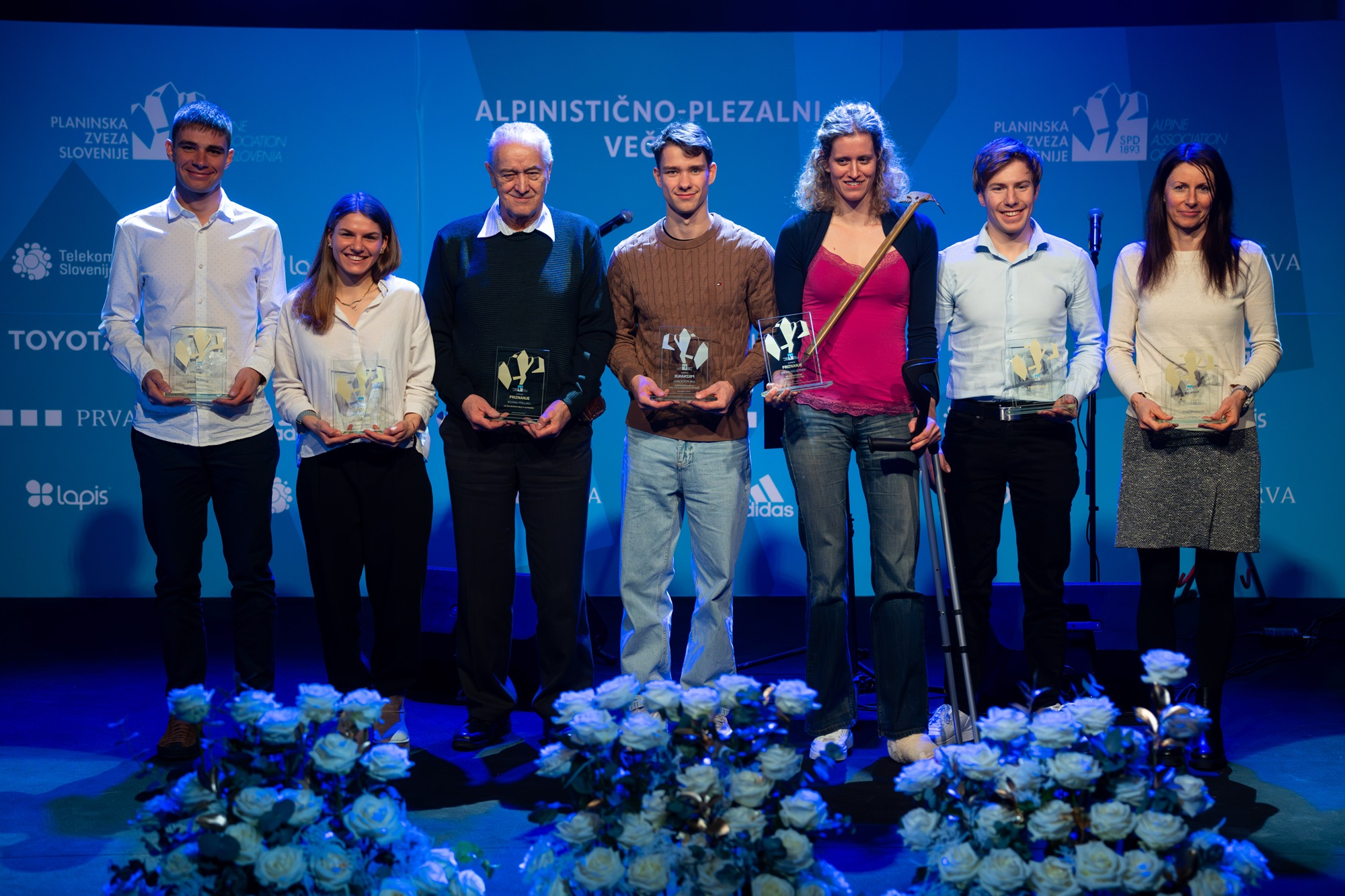Najuspešnejša tekmovalna turna smučarja Klemen Španring in Klara Velepec, prejemnik priznanja za življenjsko delo v alpinizmu Bojan Pollak, najuspešnejši športni plezalec Luka Potočar in alpinistka Ana Baumgartner ter naj tekmovalna ledna plezalca v letu 2025 Gregor Šegel in Maja Šuštar Habjan; manjkata naj športna plezalka Janja Garnbret in naj alpinist Nejc Marčič. (foto Martin Metelko/PZS)