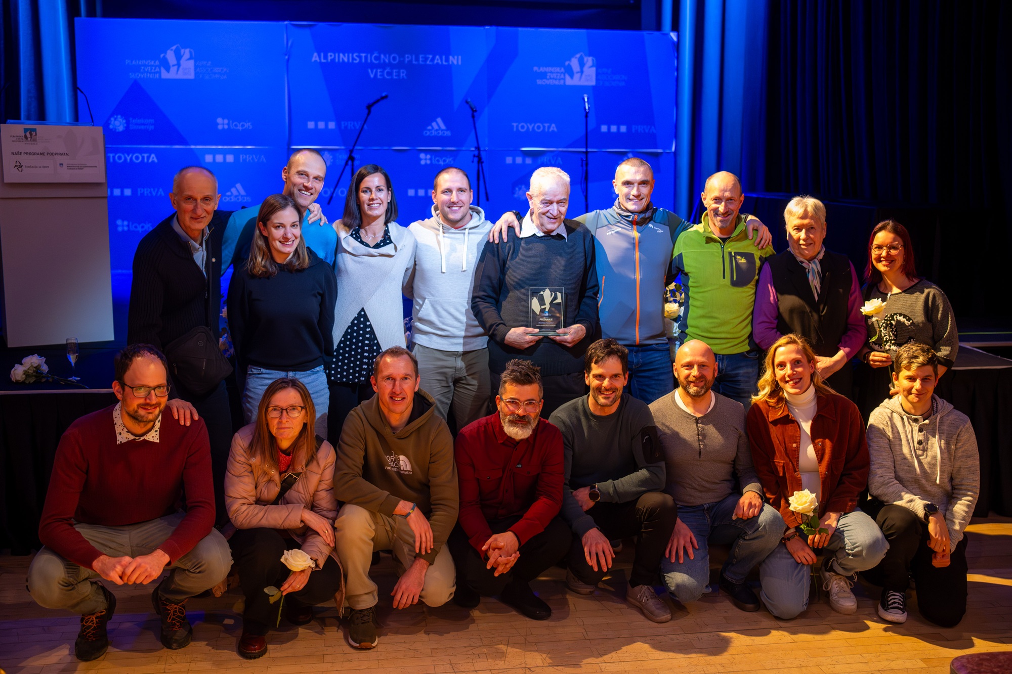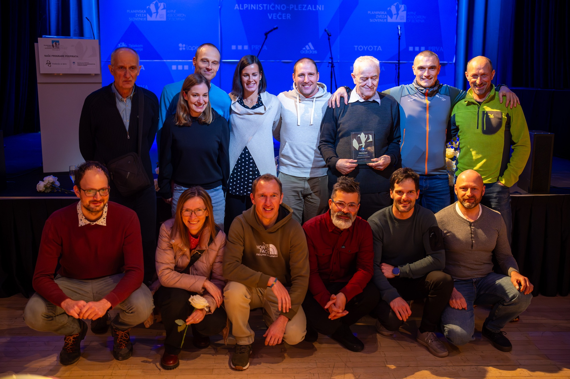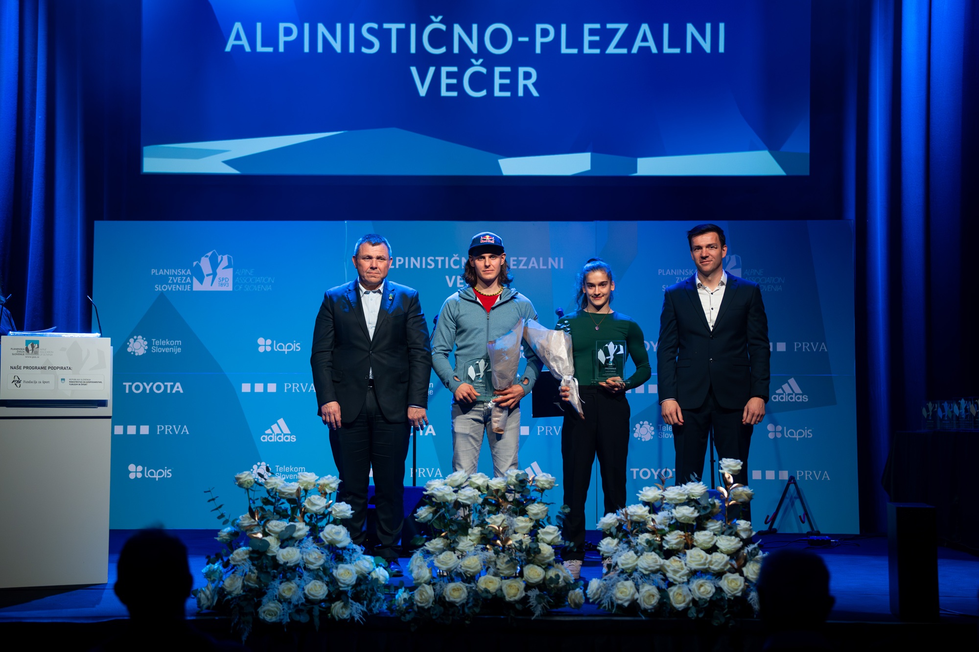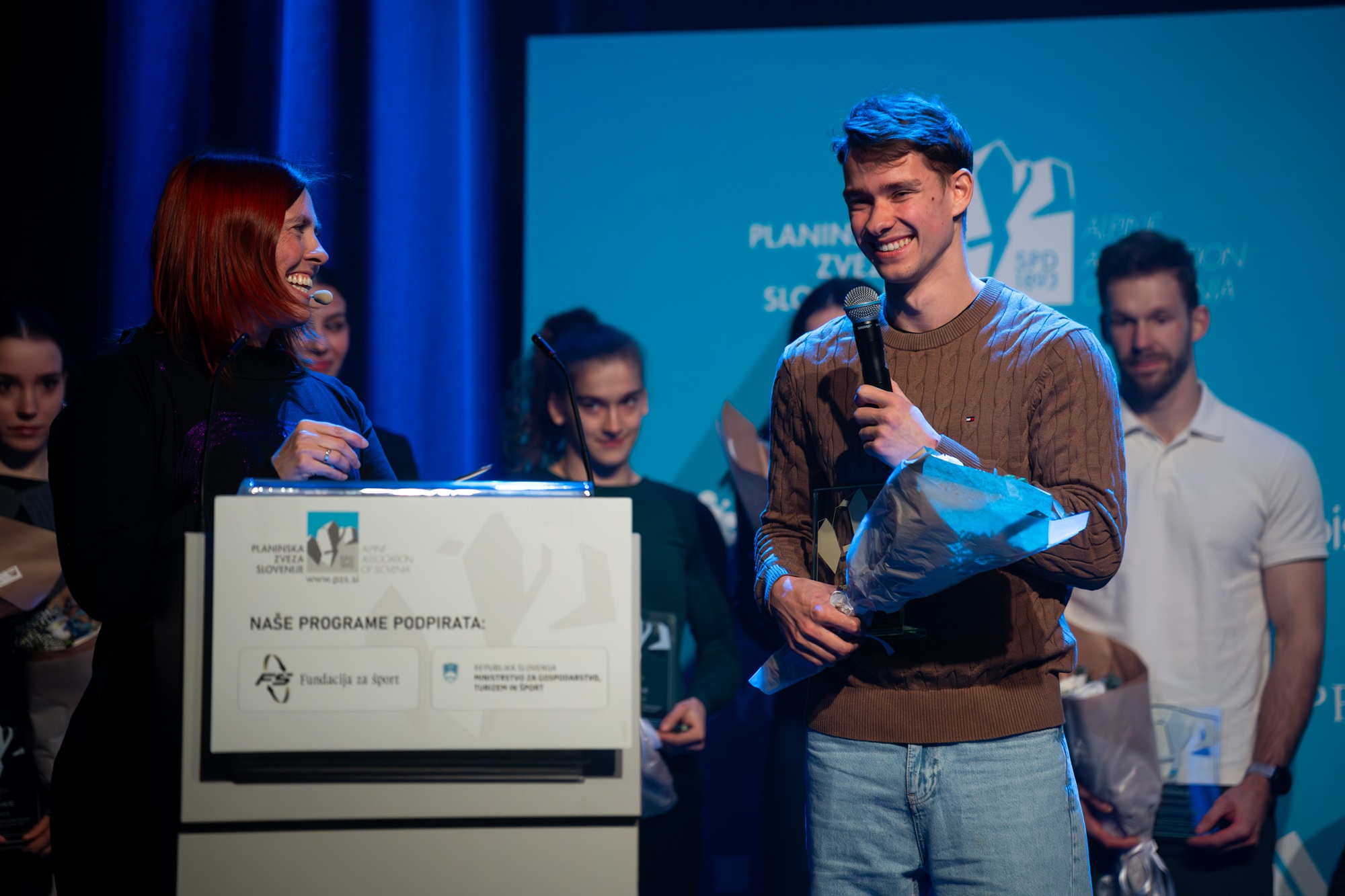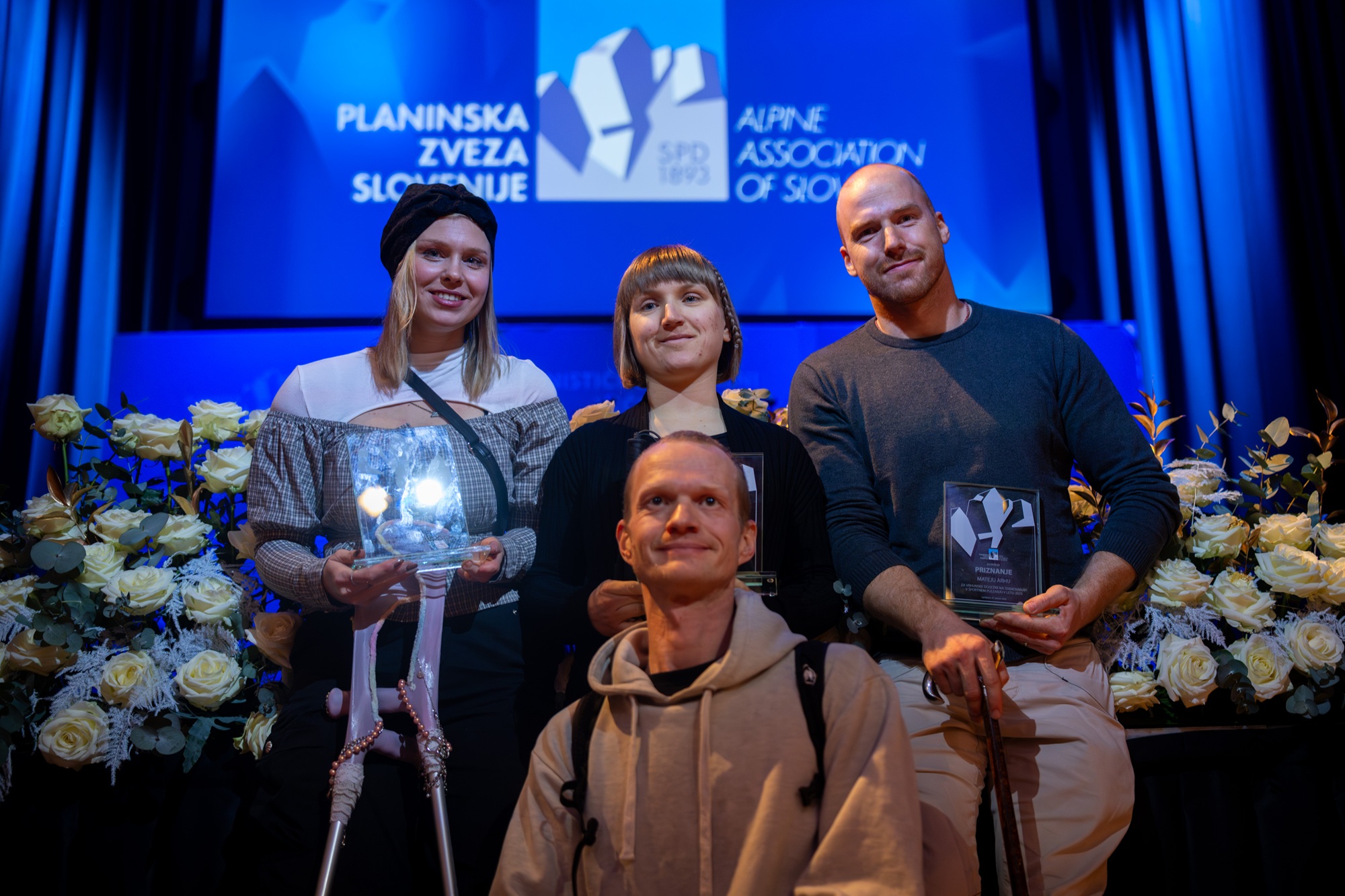 Najuspešnejša tekmovalna turna smučarja Klemen Španring in Klara Velepec, prejemnik priznanja za življenjsko delo v alpinizmu Bojan Pollak, najuspešnejši športni plezalec Luka Potočar in alpinistka Ana Baumgartner ter naj tekmovalna ledna plezalca v letu 2025 Gregor Šegel in Maja Šuštar Habjan; manjkata naj športna plezalka Janja Garnbret in naj alpinist Nejc Marčič. (foto Martin Metelko/PZS)