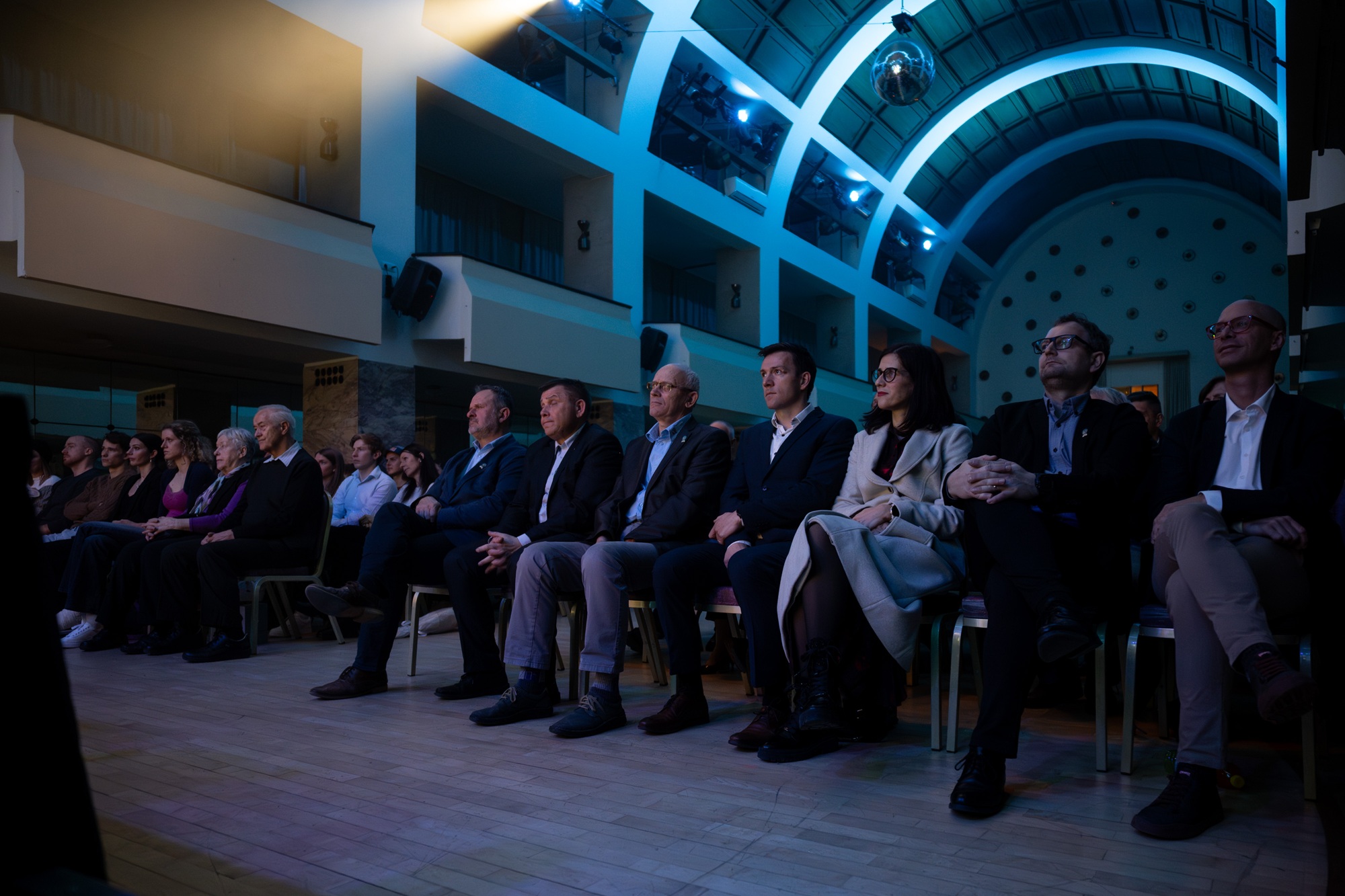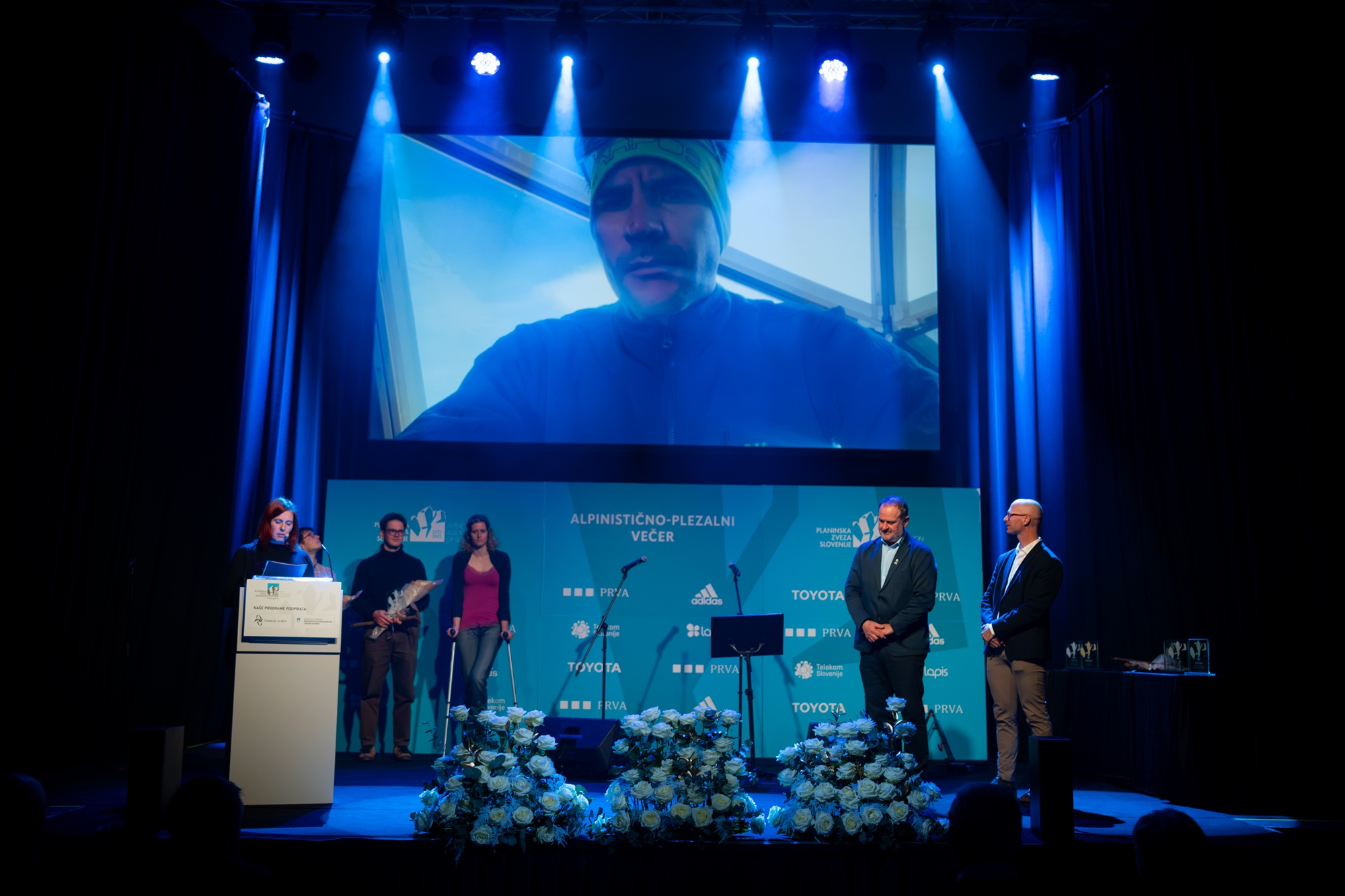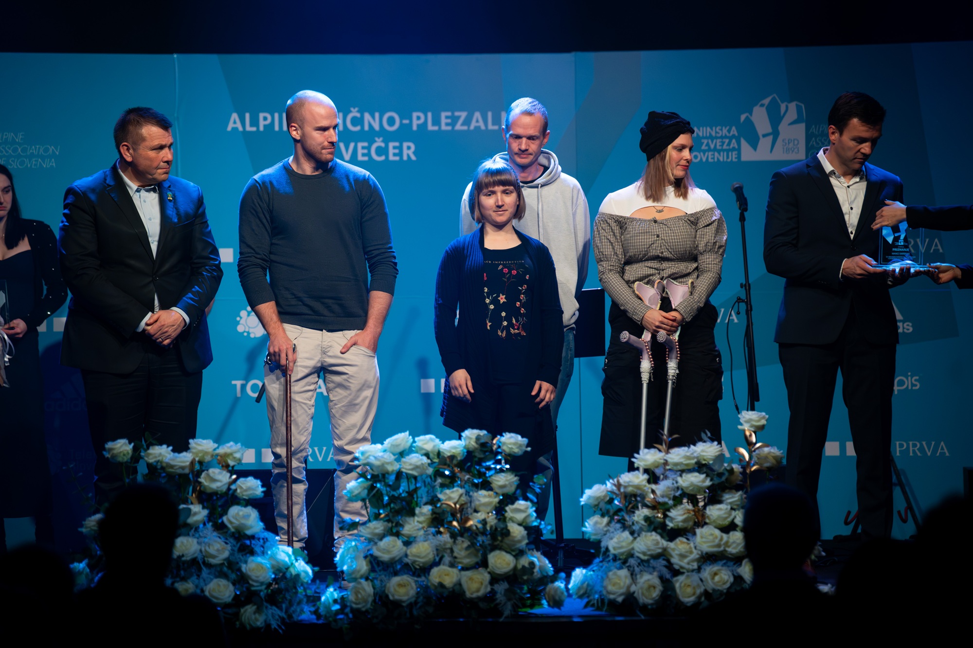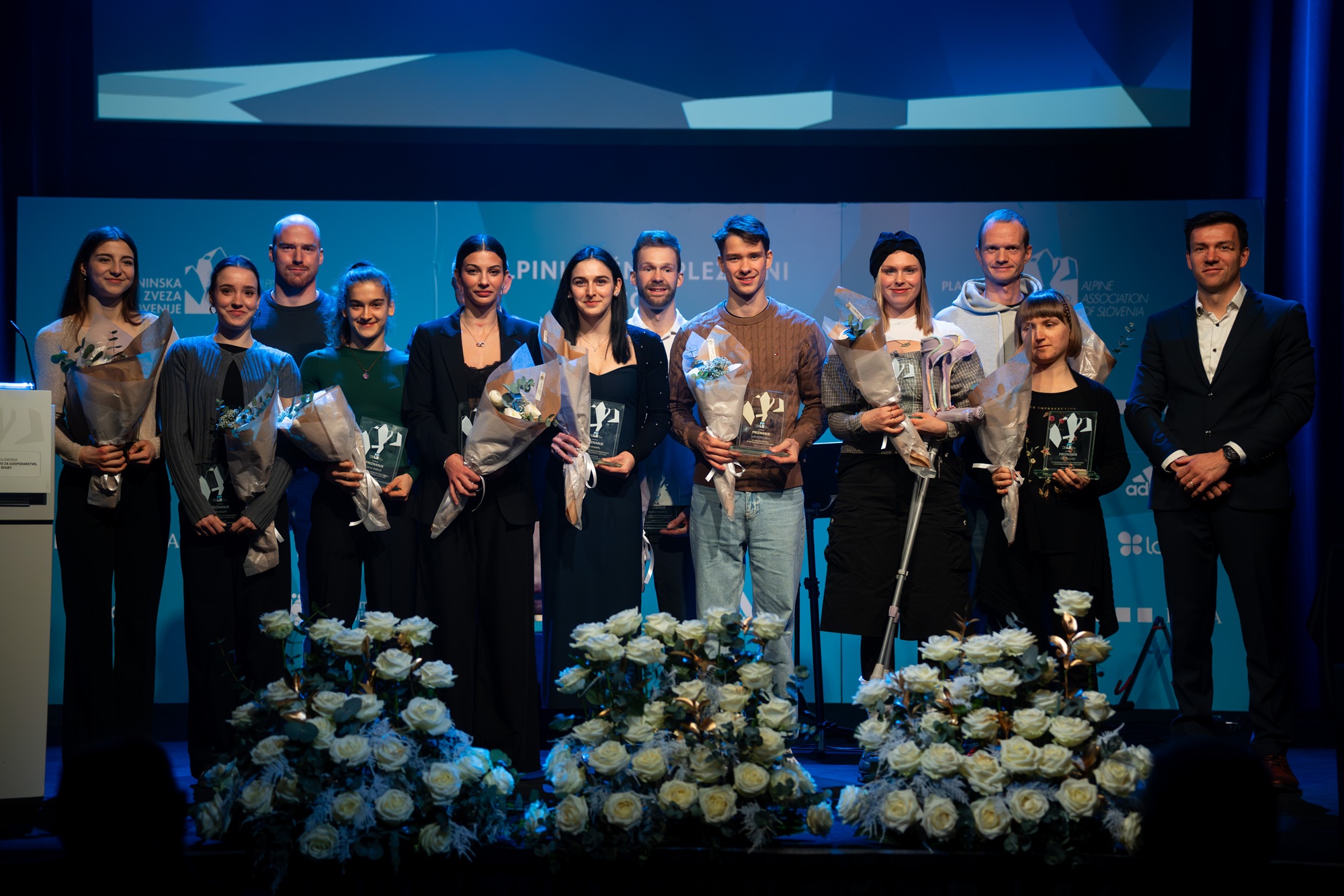 Najuspešnejša tekmovalna turna smučarja Klemen Španring in Klara Velepec, prejemnik priznanja za življenjsko delo v alpinizmu Bojan Pollak, najuspešnejši športni plezalec Luka Potočar in alpinistka Ana Baumgartner ter naj tekmovalna ledna plezalca v letu 2025 Gregor Šegel in Maja Šuštar Habjan; manjkata naj športna plezalka Janja Garnbret in naj alpinist Nejc Marčič. (foto Martin Metelko/PZS)