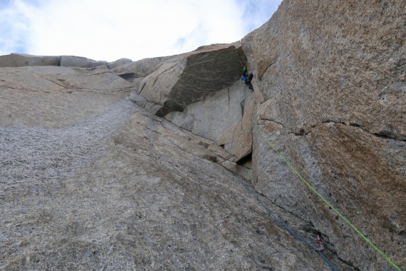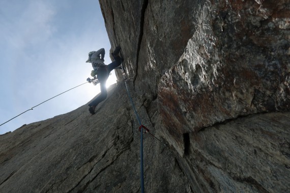 Tako sva začetne raztežaje plezala v temi. Težji raztežaji osrednjega dela smeri so postregli z res napetim in izpostavljenim plezanjem. Luka je vse raztežaje preplezal prosto in na pogled, Nejc mestoma A0.