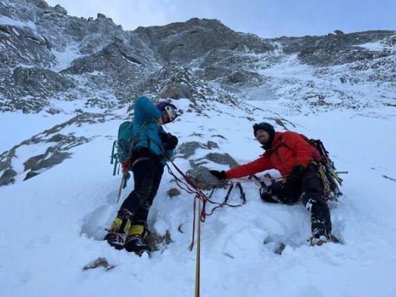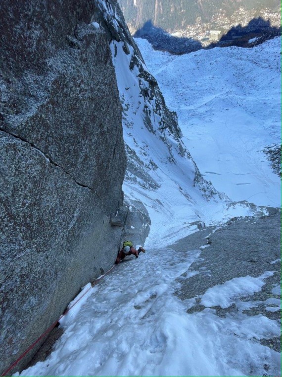 Naveza Petek-Habjan-Navršnik si je za cilj izbrala steno Velikih Jorassov. Tudi njim je dolg dostop iz doline vzel nekaj moči in so preživeli dodaten dan v zimski sobi koče Leschaux. V petek so zgodaj, v družbi dveh švicarskih alpinistov, zagazili proti Crozovi smeri. Količina novega snega pod steno je bila ogromna, zato so bili po 6-urnem dostopu do stene in dveh preplezanih raztežajih primorani obrniti. Anja je sobotno jutro izkoristila še za vzpon nad srednjo postajo gondole, z Mihaelom pa sva se vrnila po opremo na ledenik Argentiere.