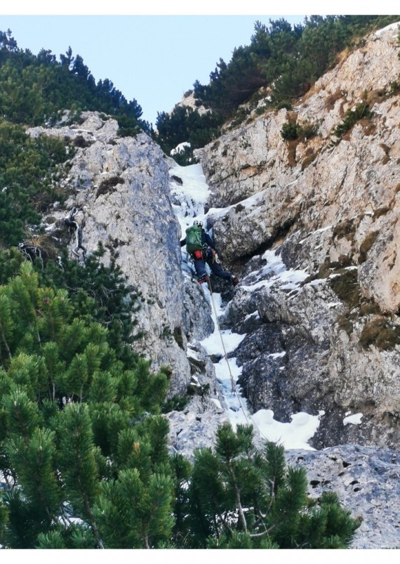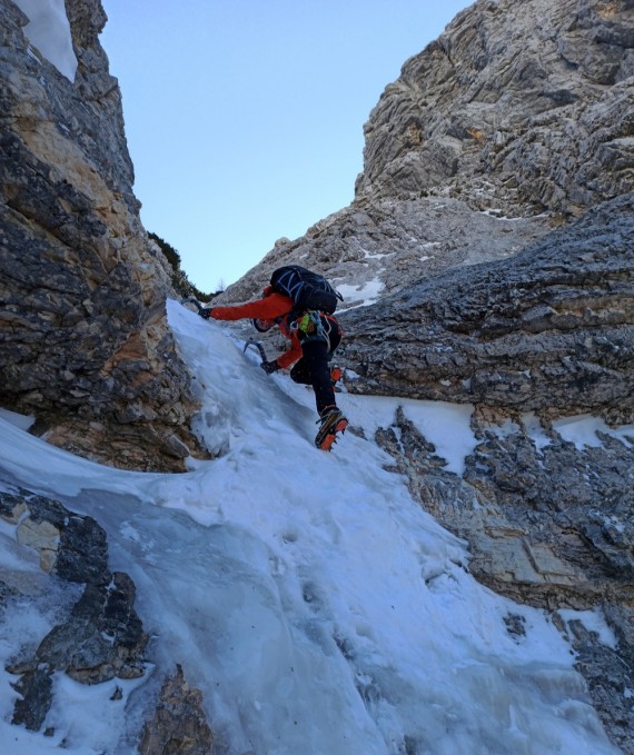 • Meniskusov žleb III, 60°/ 40°-45°, 300 m - Vodopivec, Klinec