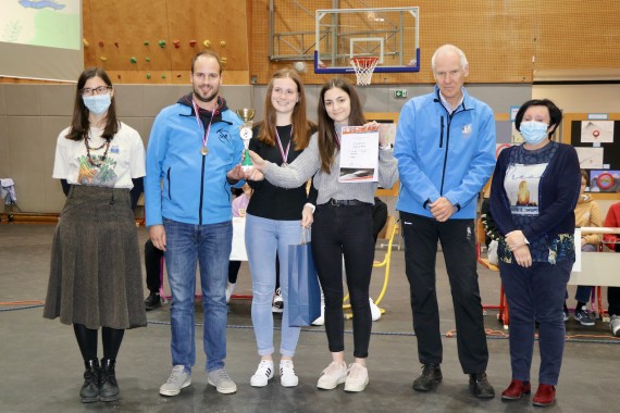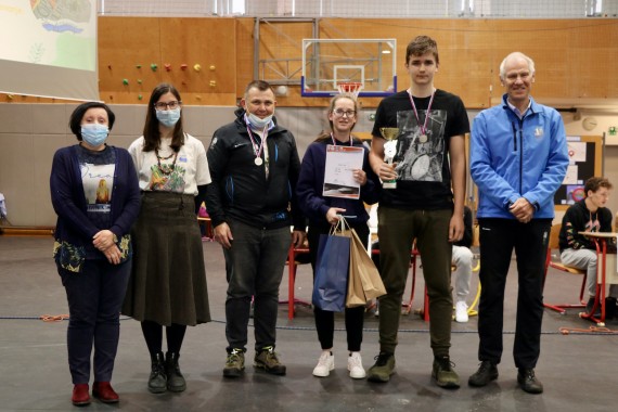 Srednješolski zmagovalki Gorski kuri iz PD Tržič z mentorjem Gorazdom Černilcem, načelnico Mladinske komisije PZS Ano Suhadolnik, koordinatorico tekmovanja Brigito Čeh in predsednikom PZS Jožetom Rovanom (foto Manca Ogrin)