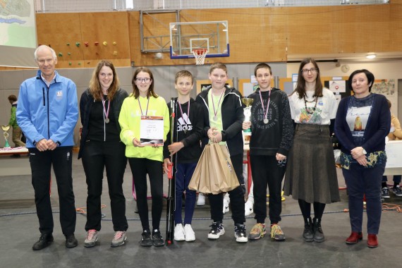 Ponosni osnovnošolski državni prvaki Nanoške zveri iz PD Postojna z mentorico Veroniko Biščak, predsednikom PZS Jožetom Rovanom, načelnico Mladinske komisije PZS Ano Suhadolnik in koordinatorico tekmovanja Brigito Čeh (foto Manca Ogrin)