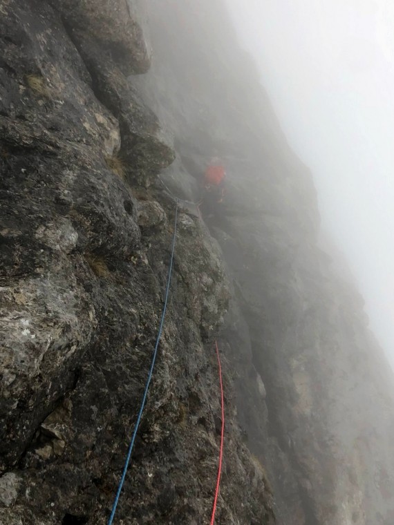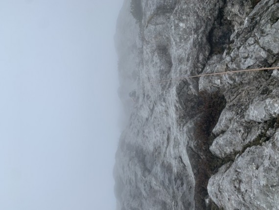 - Poizkus v smeri Ponoreli svet, umik v Koroško smer, V/IV, 165 m, Mihev-Meh