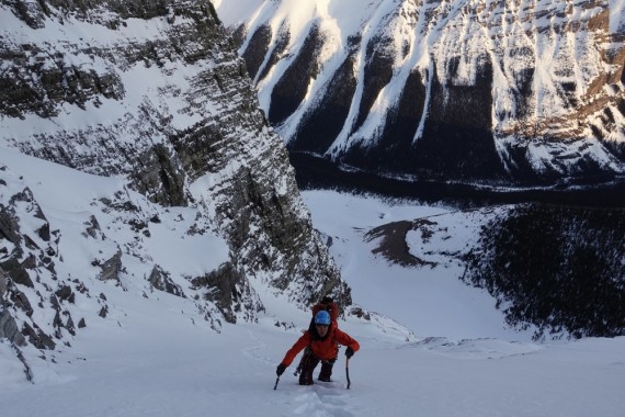 Z več energije je nadaljevanje potekalo bolje in kljub muhastim snežnih razmeram nama je uspelo preplezati par dobrih kombiniranih smeri. Ravno to je bil najin plan za prvi del akcije, saj sva hotela bit dobro pripravljena za večje stene ko bi se naj začela pomladna sezona zanje. Med številnimi idejami, sva se odločila, da preveriva zelo atraktivno novo linijo v severni steni Mt. Kitchener. Ko so snežne razmere dovolile sva dostopila do pod stene. Tam sva z daljnogledom dolgo opazovala linijo in dogajanje v steni. Odlična linija naju je tako zaslepila, da kar nekaj časa nisva hotela videti ogromnega seraka. Hitro je postalo jasno, da je linija plezljiva in verjetno ponuja odlično kombinirano plezanje, a tudi, da je polovica linije izpostavljena seraku. V takšnih trenutkih te zamika, da bi zamižal na eno oko in tvegal, ker je linija tako mikavna. Midva sva se odločila za povratek.