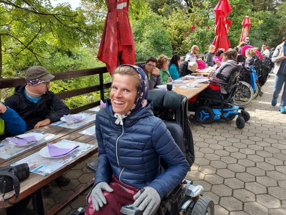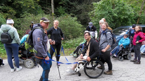 Na sliki trije planinci zraven ženske na invalidksem vozički pred kočo, arhiv inPlaninec