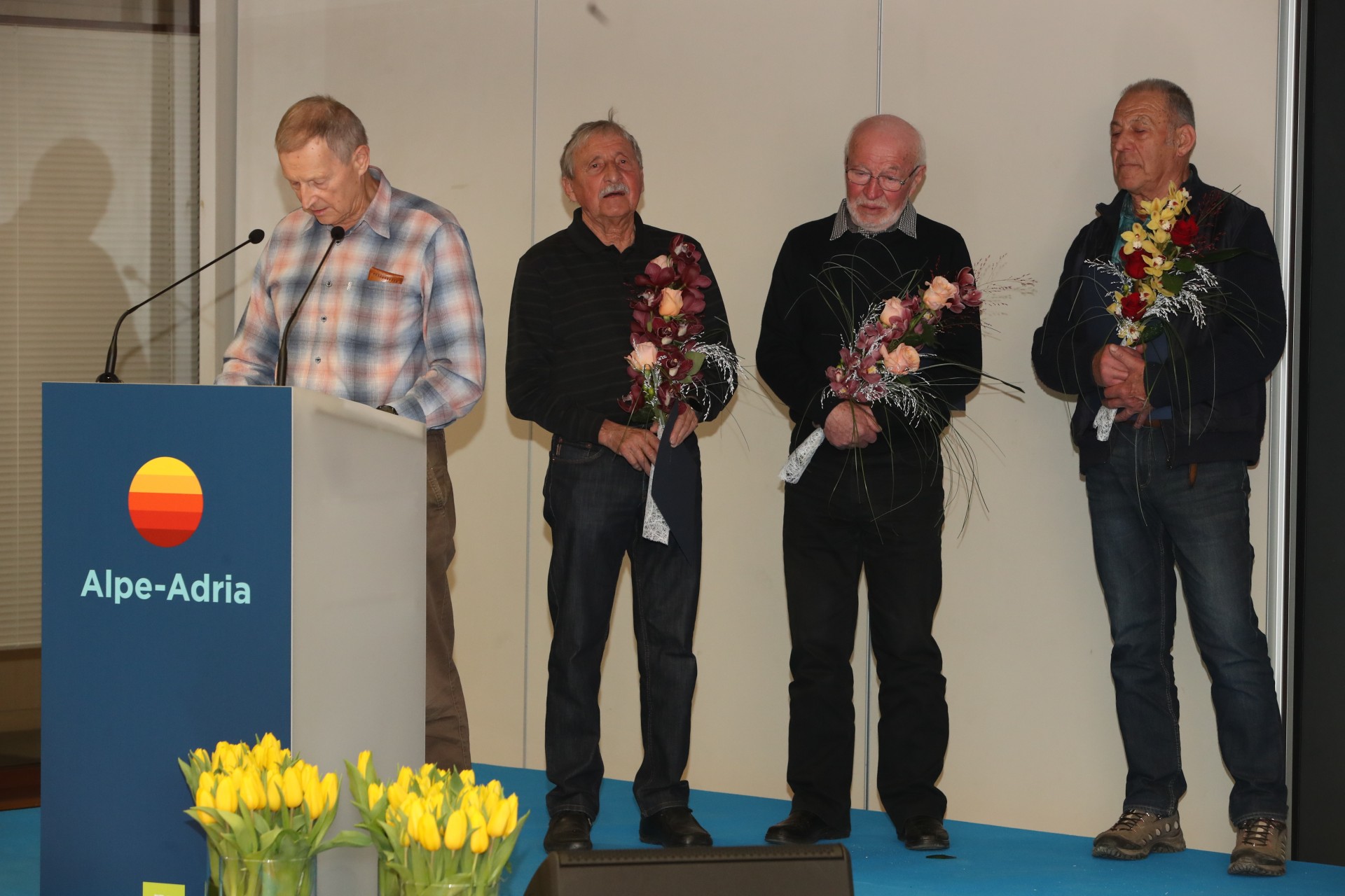 alpinisti_ni_ve_er4_manj_aMojstranške veverice so prejeli priznanje za življenjsko delo (od leve stojijo Janez Dovžan, Janez Brojan, Klavdij Mlekuš in Janko Ažman, posthumno je priznanje za pokojnega moža prevzela žena Mihe Smoleja) (foto Irena Mušič Habjan)