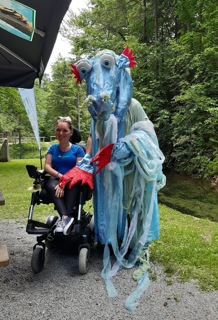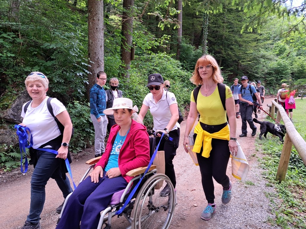 Na sliki v ospredju osebe na invalidksih vozičkih za njiji pa stojijo pohodniki, arhiv inPlaninec