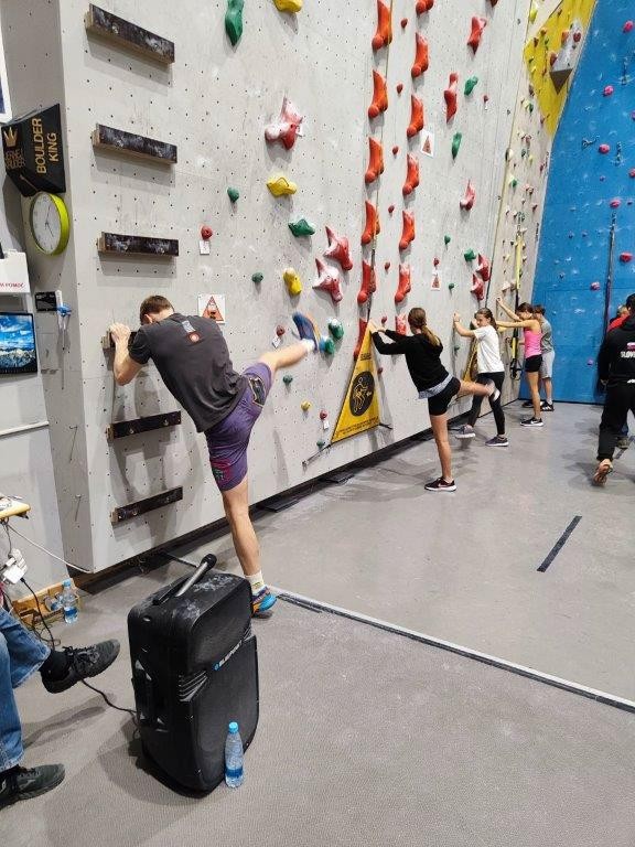 Po teoretičnem delu smo se preselili v telovadnico, kjer smo sodelovali z mlajšimi kategorijami. Ogrevanje je vključevalo inovativne vaje, kot so kolebnica, različni poligoni ter dinamične igre, ki so bile prilagojene mlajšim plezalcem. Nadaljevali smo z vajami, uporabljajoč trx trakove in elastične trakove, ki simulirajo gibanje plezanja po hitrostni smeri. Trener Bassoli nas je učil treh ključnih koordinacijskih gibov, ki so ključni za napredovanje v hitrostnem plezanju.