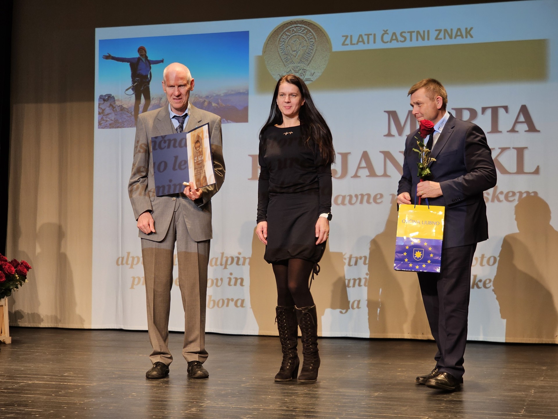 Prejemnica zlatega častnega znaka PZS Marta Krejan Čokl s predsednikom PZS Jožetom Rovanom in podpredsednikom Romanom Ponebškom (foto Manca Ogrin)