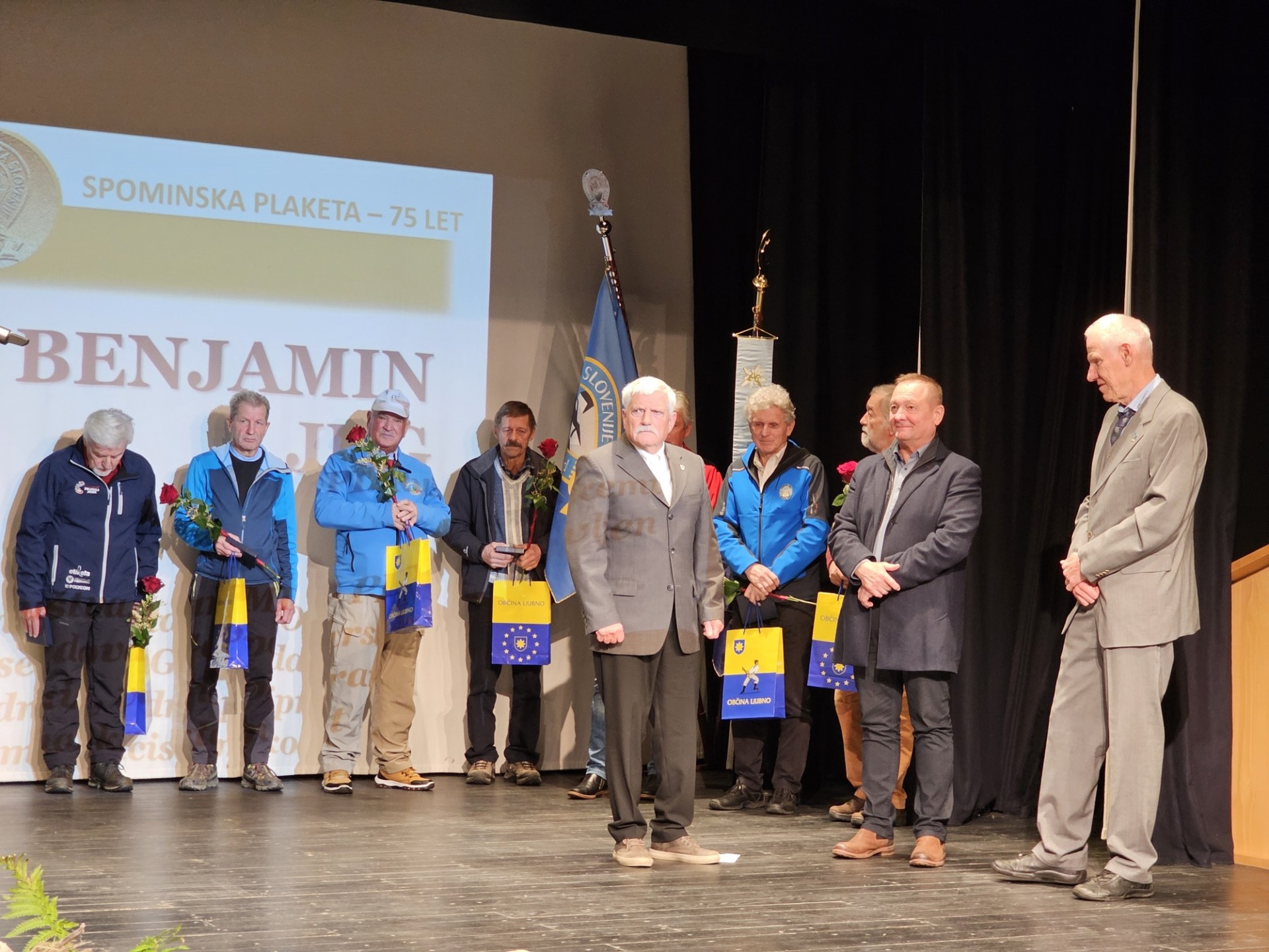 Prejemniki spominskih plaket PZS 2023 ob življenjskih jubilejih s predsednikom PZS Jožetom Rovanom in županom Občine Ljubno Franjem Naraločnikom (foto Manca Ogrin)