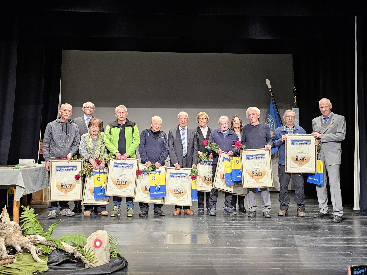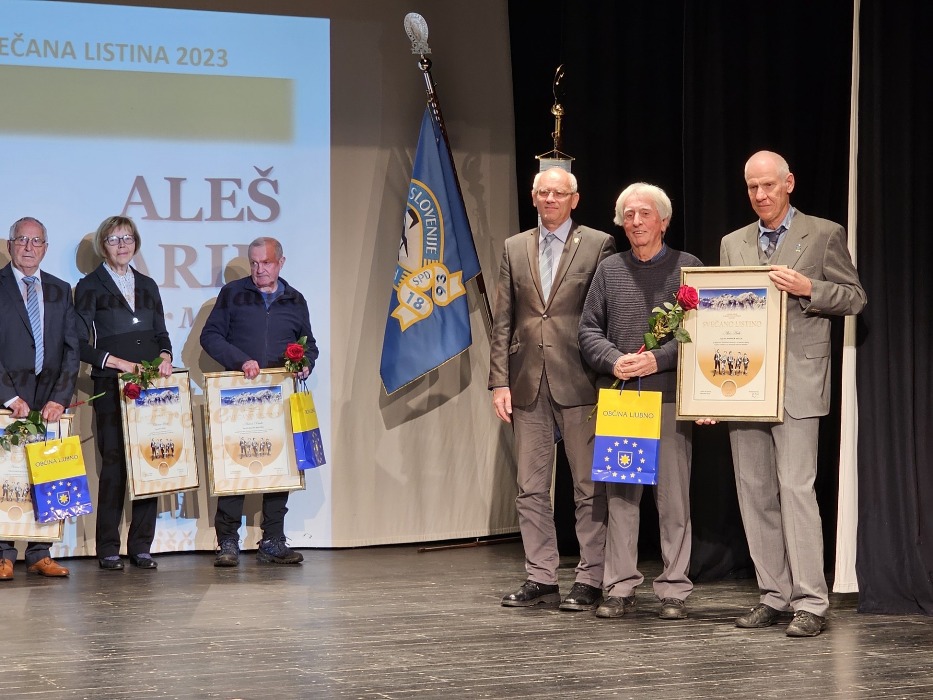 Prejemniki svečanih listin PZS, najvišjih priznanj Planinske zveze Slovenije, za leto 2023 s predsednikom PZS Jožetom Rovanom in podpredsednikom Jožefom Bobovnikom (foto Manca Ogrin)