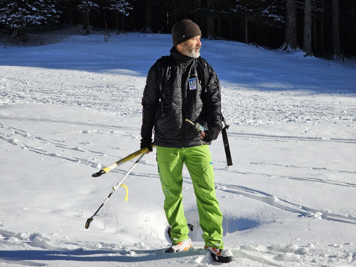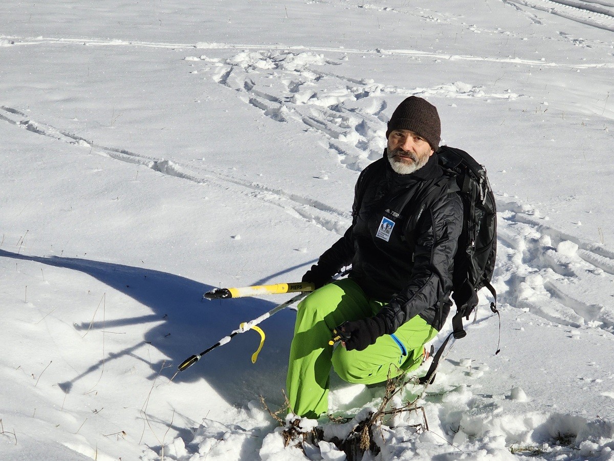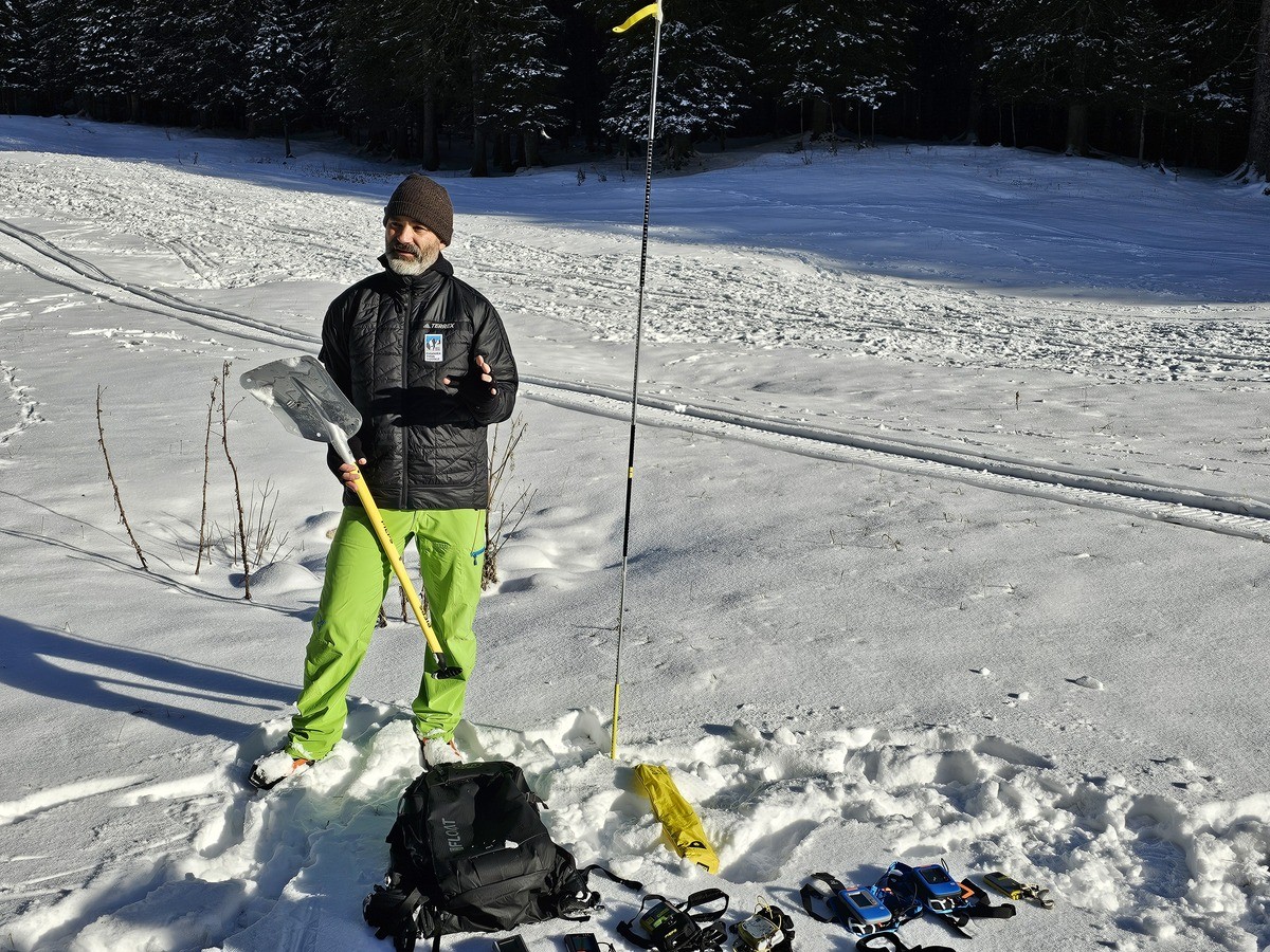 Vsakdo, ki se pozimi znajde v gorah, bi moral obvladati dvosmerni test plazovnih žoln, iskanje zasutega s plazovno žolno in odkopavanje zasutega, je izpostavil strokovni sodelavec PZS in gorski reševalec Matjaž Šerkezi. (foto Manca Ogrin)