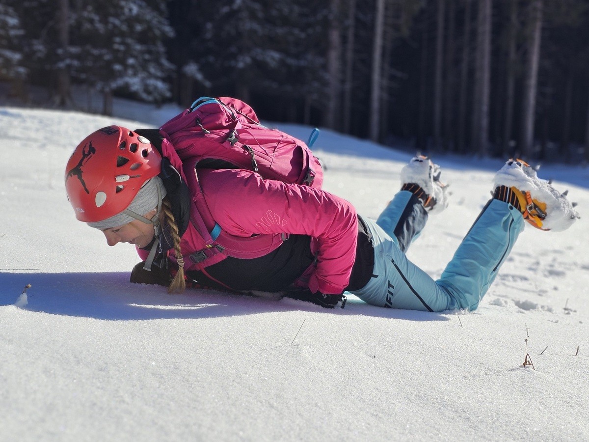 Pozimi moramo korak prilagoditi snežnim razmeram, prav tako odločitev, kdaj je čas, da si nadenemo dereze in palice v rokah zamenja cepin, na glavo pa sodi čelada. Na fotografiji Klara Kavčič iz Mladinske komisije PZS demonstrira ustavljanje s cepinom. (foto Manca Ogrin)