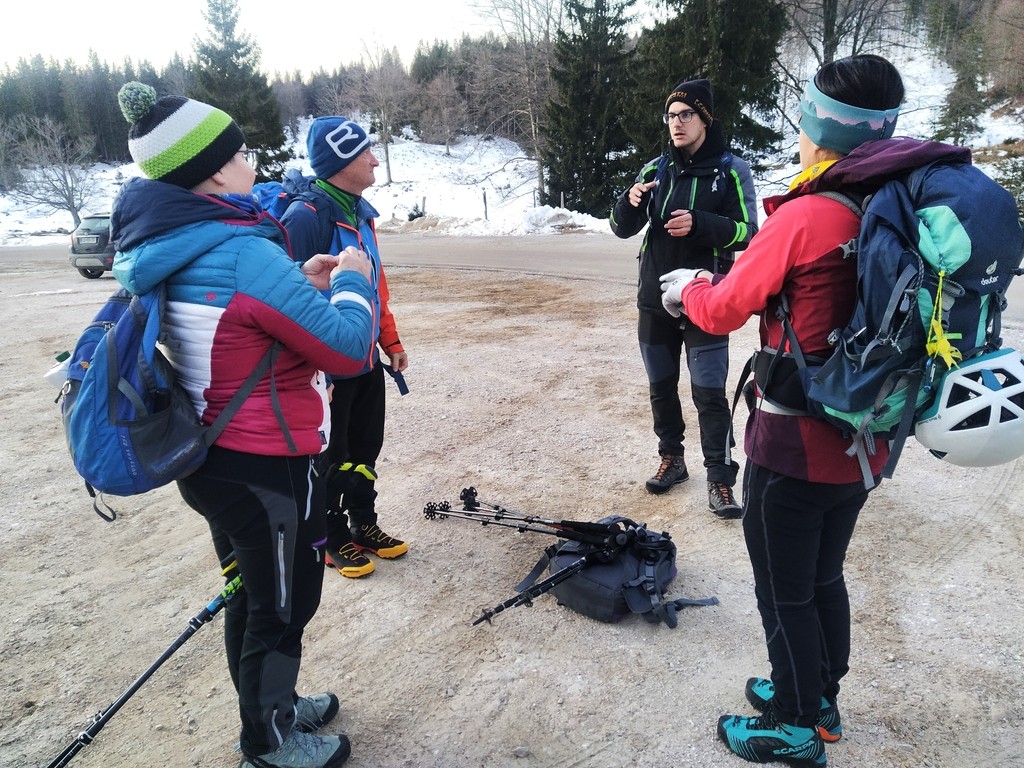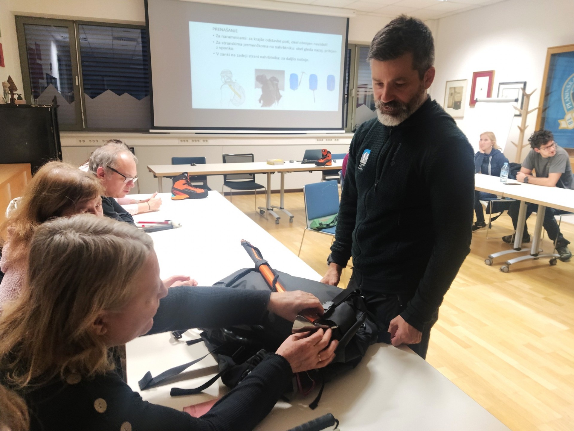 V petek popoldne, 26. januarja 2024, smo se najprej udeležili teoretičnega dela, kjer nam je Matjaž Šarkezi jasno in sistematično predstavil vsak kos opreme, ki ga priporoča za varno hojo v zimskih razmerah. Z jasnim prikazom nam je omogočil, da smo kar najbolje razumeli namen uporabe vseh pripomočkov. Pomemben poudarek je bil na tehničnih detajlih, kot so pravilno nameščanje derez, uporaba cepina in pravilna izbira oblačil in nahrbtnikov. Všeč nam je bilo tudi, da je prispeval še marsikateri sočen primer iz svojih bogatih gorniških izkušenj.