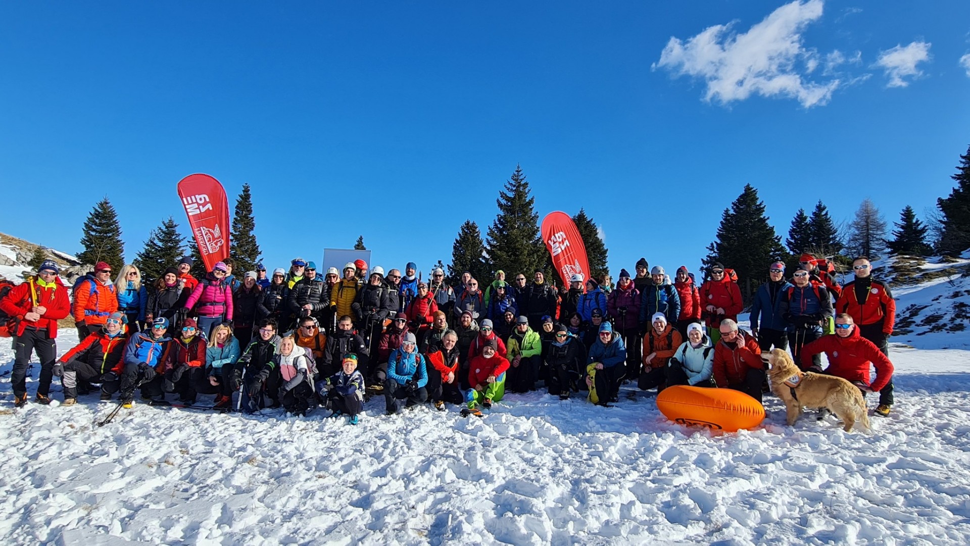 Na sliki velika skupina inPlanincev in gorskih reševalcev, stojijo na zasneženem poboču, arhiv inPlaninec