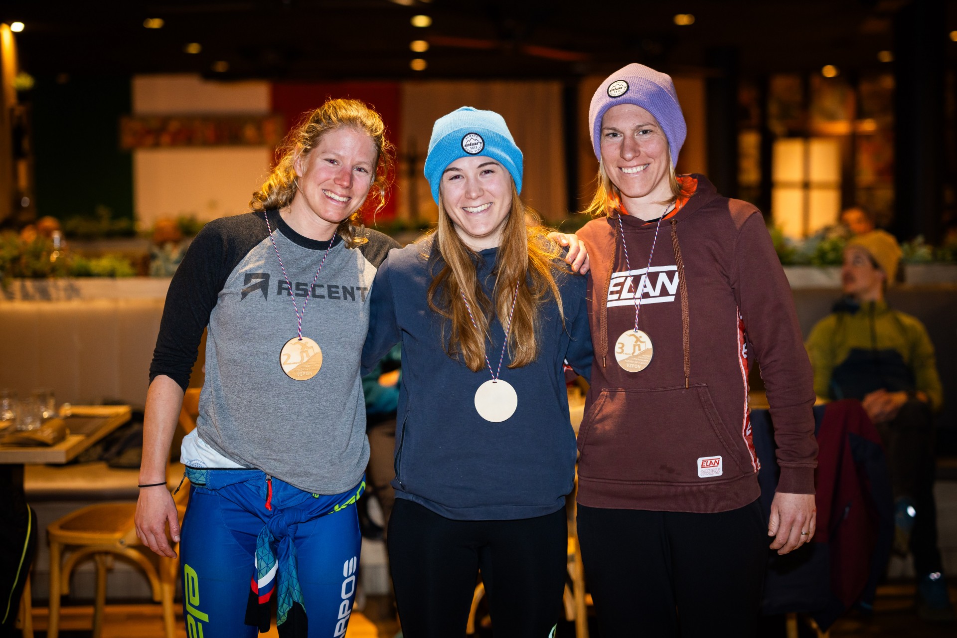 Državna prvakinja v vzponu Ana Čufer (na sredini), Rea Kolbl (levo) na drugem in Karmen Klančnik Pobežin (desno) na tretjem mestu na Lumarjevem vertikalu 2024 (foto Jure Banfi/Pigac.si)