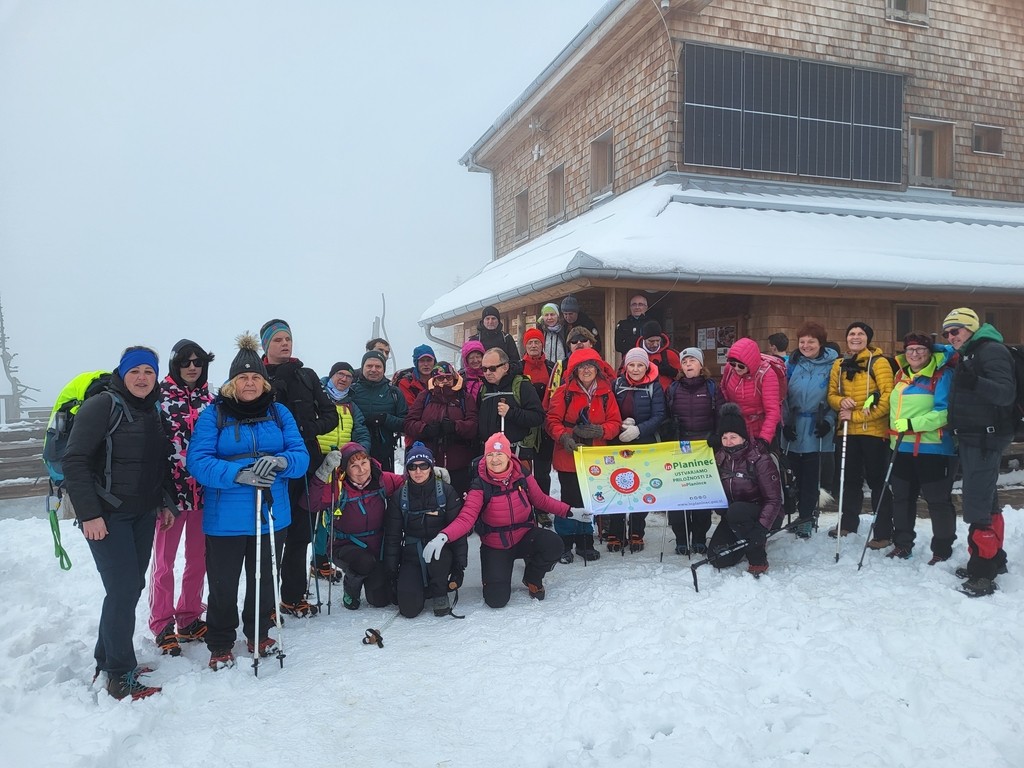 Na sliki stoji v snegu skupina inPlanincev z zastavo inPlaninec pred kočo, arhiv inPlaninec