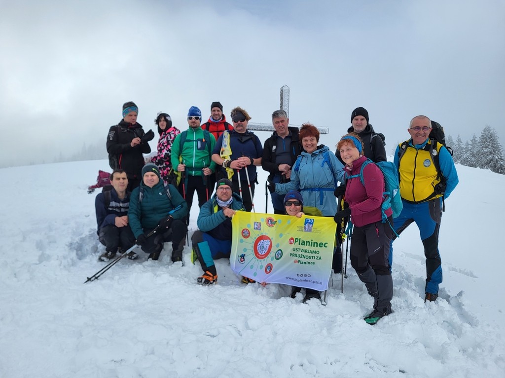 Na sliki skupina inPlanincev v snegu pred križem v daljavi se vidijo smreke, arhiv inPlaninec