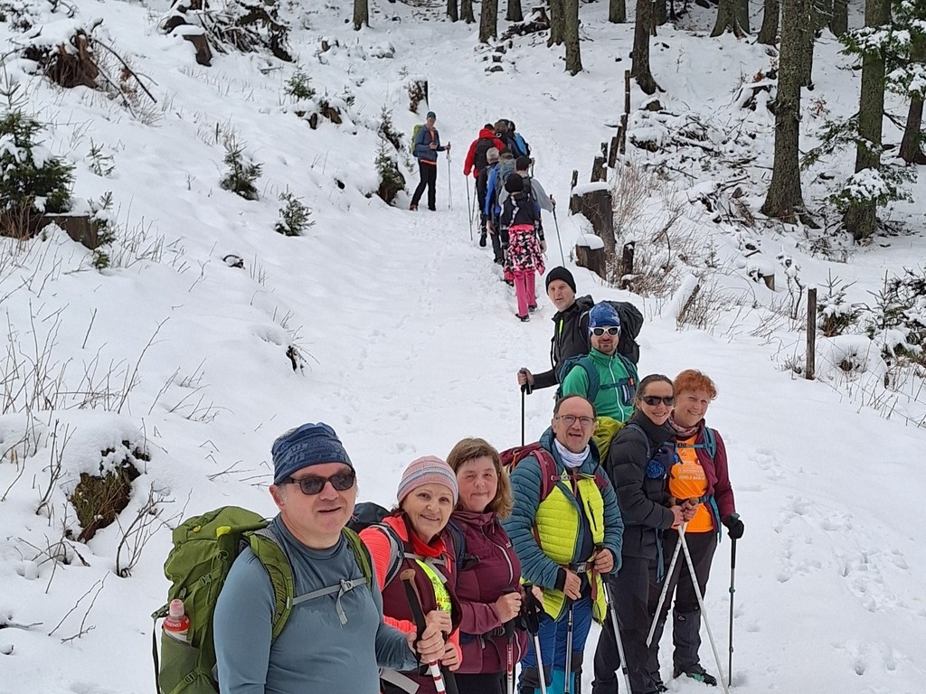 Na sliki se po zasneženi poti, ki jo obdajajo zasnežene smreke, vzpenja skupina inPlanincev, arhiv inPlaninec