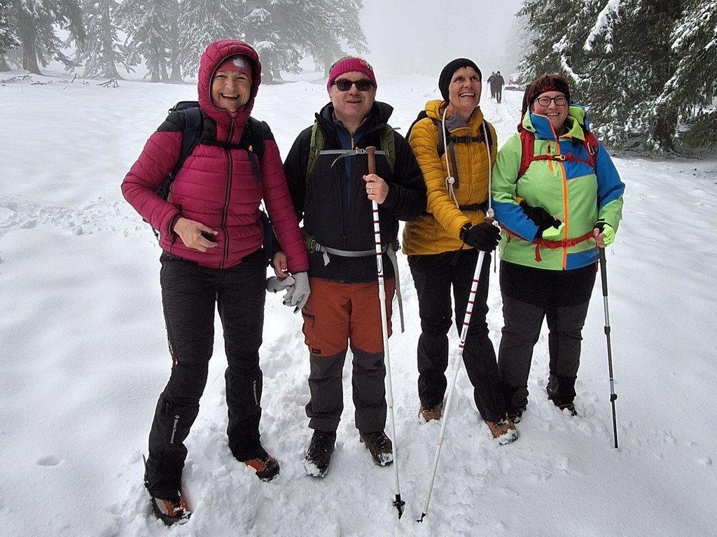 Na sliki se tri ženske in en moški smejijo, stojijo na snegu, za njimi se vzpenjajo zasnežene smreke, arhiv inPlaninec