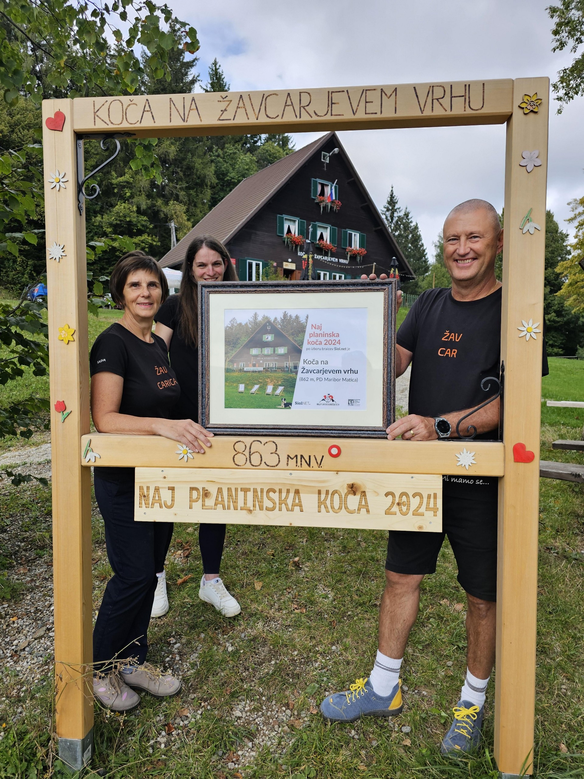 Plaketa v roke najemnikov Koče na Žavcarjevem vrhu, naj planinske koče 2024 (foto Manca Ogrin)