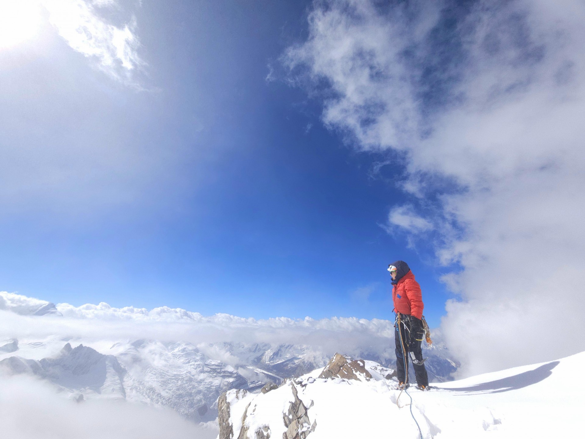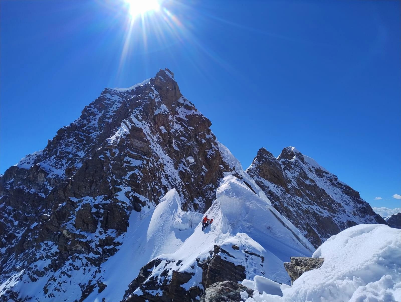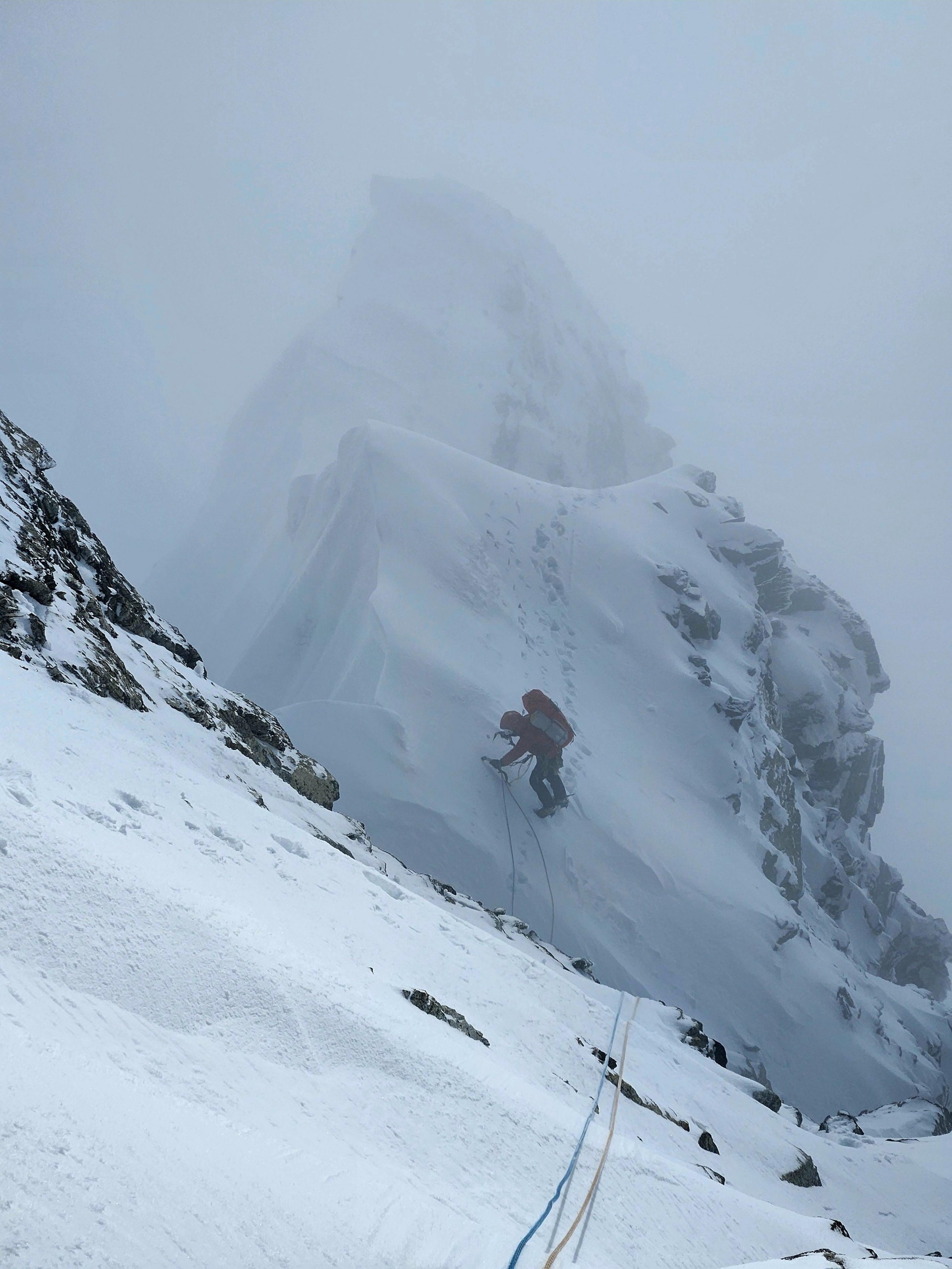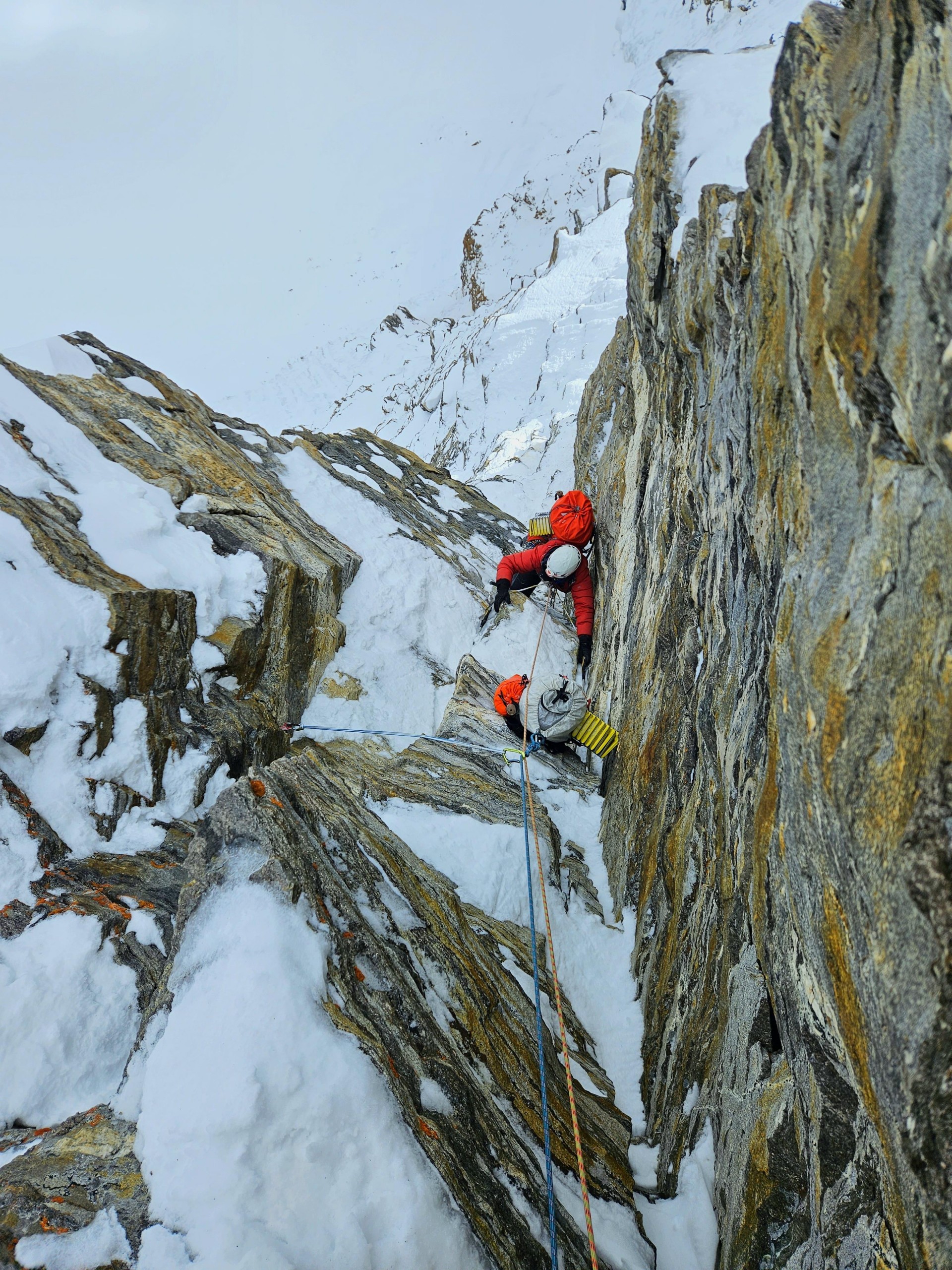 Napovedano vremensko okno je kazalo, da bo dobro sodelovalo z najinim načrtom, vendar sva bili že drugi plezalni dan na grebenu primorani sredi dneva postaviti šotor in bivakirati zaradi snežnega meteža, ki je trajal še celoten tretji dan. Četrti dan sva se zbudili v sončno jutro in nadaljevali s plezanjem pozno v noč, a še vedno nisva dosegli vrha. Nato je sledil še peti dan na grebenu, ki je od naju zopet zahteval ogromno vztrajnosti in volje. Ob 1.30 ponoči sva izplezali še zadnje mešane raztežaje in se odpravili k počitku. Na mestu bivakiranja nama je v trenutku neprevidnosti in utrujenosti veter odpihnil palice od šotora, a do takrat sva bili že vajeni bivakiranja v steni in naju spanje v bivak vreči ni pretirano šokiralo. Naslednji dan sva se zbudili v megleno jutro z difuzno svetlobo. Zelo težko sva razbirali nepoznan teren do vrha samega Lalunga I, kamor sva priplezali po lažjih snežnih pobočjih ob 9. uri zjutraj.