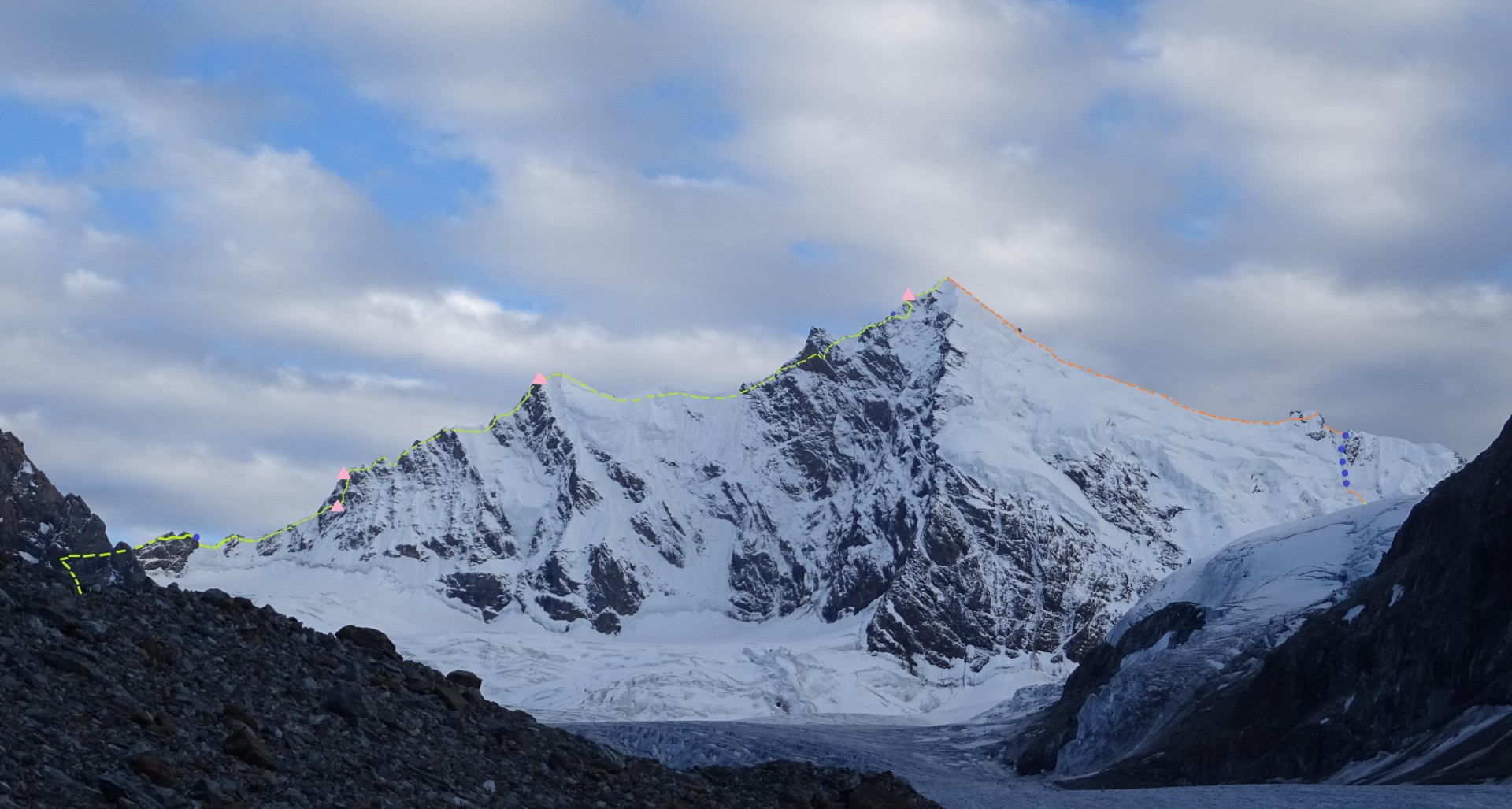 13. september: Vrh 5332 m; Calm before the storm?; V+/IV, 670 m, 6 h. (Ana Baumgartner in Urša Kešar)