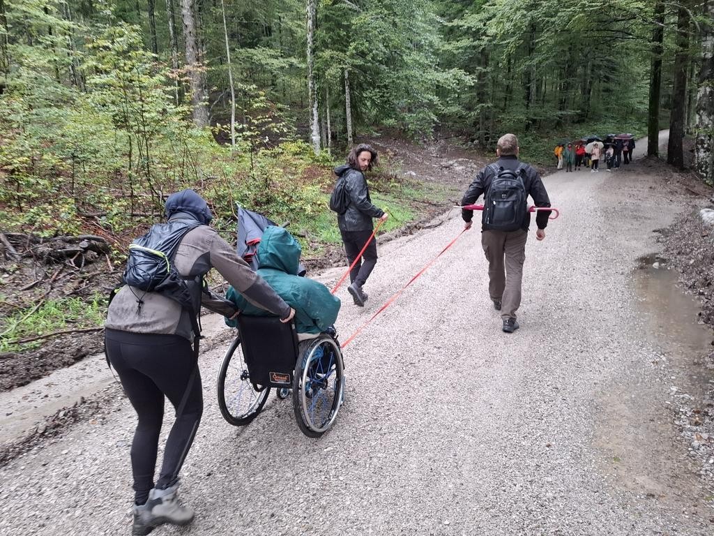 Na sliki skupina prostovoljcev hodi poi makadamski gozndi potu ob osebi na invalidskem vozičku, arhiv inPlaninec