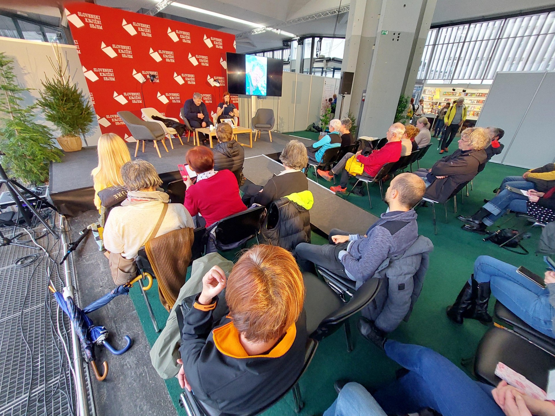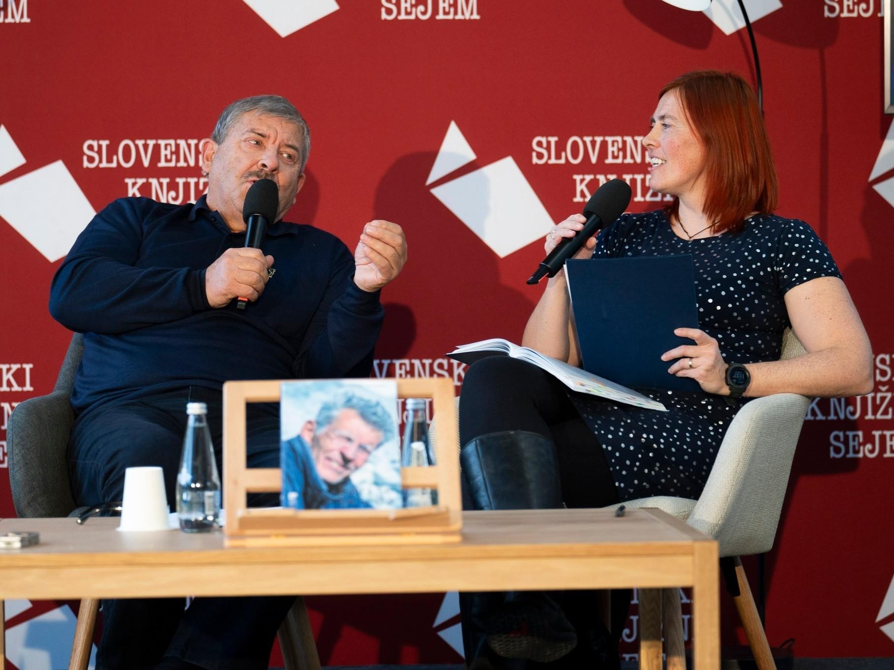 Žarkom Rovščkom na Pisateljskem odru, ki je letos v Stekleni dvorani.