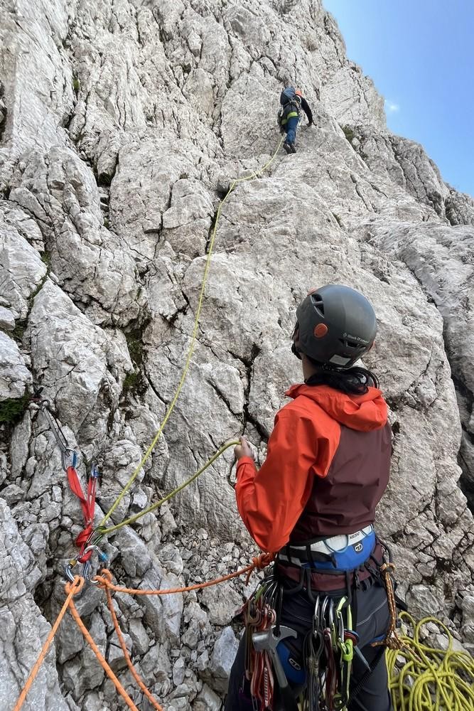 • Maja Galun: Sama s plezanjem neopremljenih smeri skoraj nisem mela izkušenj, zato sem zelo vesela da sem dobila priložnost, da se z začnem spoznavati s hribovskimi smermi prav na tak način. Naveze tečajnikov, kot tudi smeri so bile določene premišljeno in z občutkom, tako se je lahko vsak udeleženec v svojem tempu učil in napredoval. Inštruktorji so bili zelo potrpežljivi in se vsakemu tečajniku prilagodili glede na njegove izkušnje in znanje. Zelo mi je bilo všeč tudi to, da je naveza dobila drugega inštruktorja vsak dan, tako smo lahko res videli različne pristope in strategije nameščanja varoval. Skupaj smo preživeli zelo poučen in zabaven vikend v hribih proti domu pa smo odšli polni novih izkušenj, znanja ter zagona za plezanje v hribih. Zagotovo je to izkušnja, ki bi jo priporočala vsem tečajnikom! Hvala inštruktorjem za njihov čas in predano znanje, sotečajnikom pa za prijetno druženje in izmenjavo izkušenj. Upam, da se še kdaj srečamo, mogoče tudi na nasprotnem koncu vrvi.