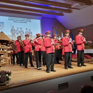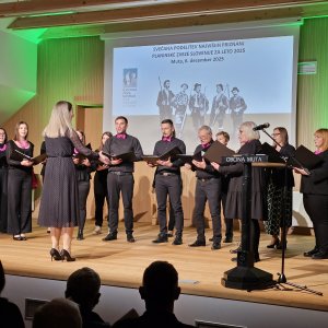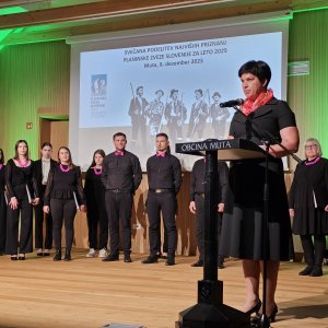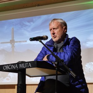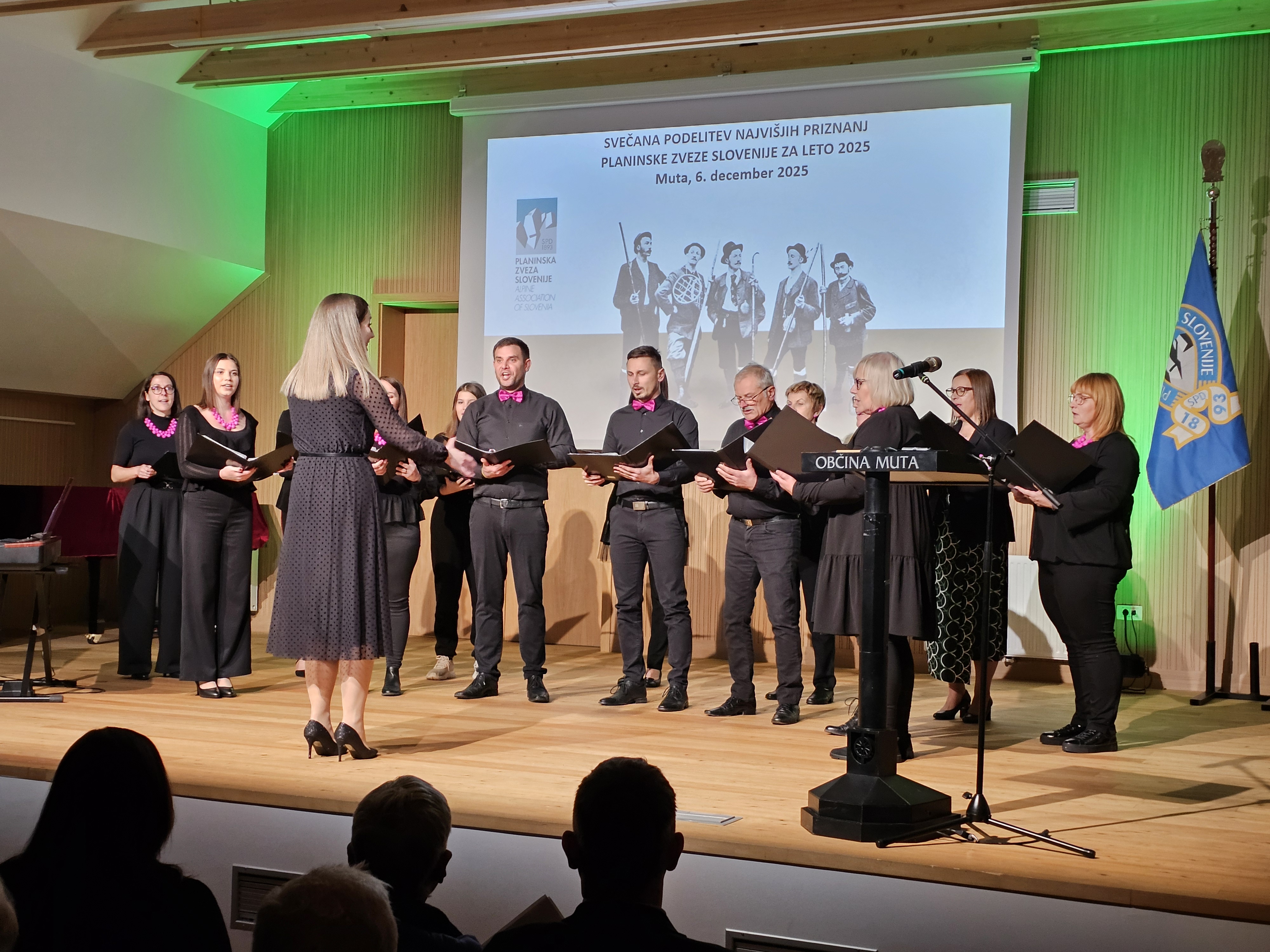 Svečana podelitev najvišjih priznanj Planinske zveze Slovenije za leto 2025 na Muti. V prvi vrsti generalni sekretar PZS Damjan Omerzu, slavnostni govornik Ivan Kotnik - Ivč, županja Občine Muta Angelca Mrak, predsednik PZS Jože Rovan in predsednica Planinskega društva Bricnik Muta Andreja Senica. (foto Manca Ogrin)