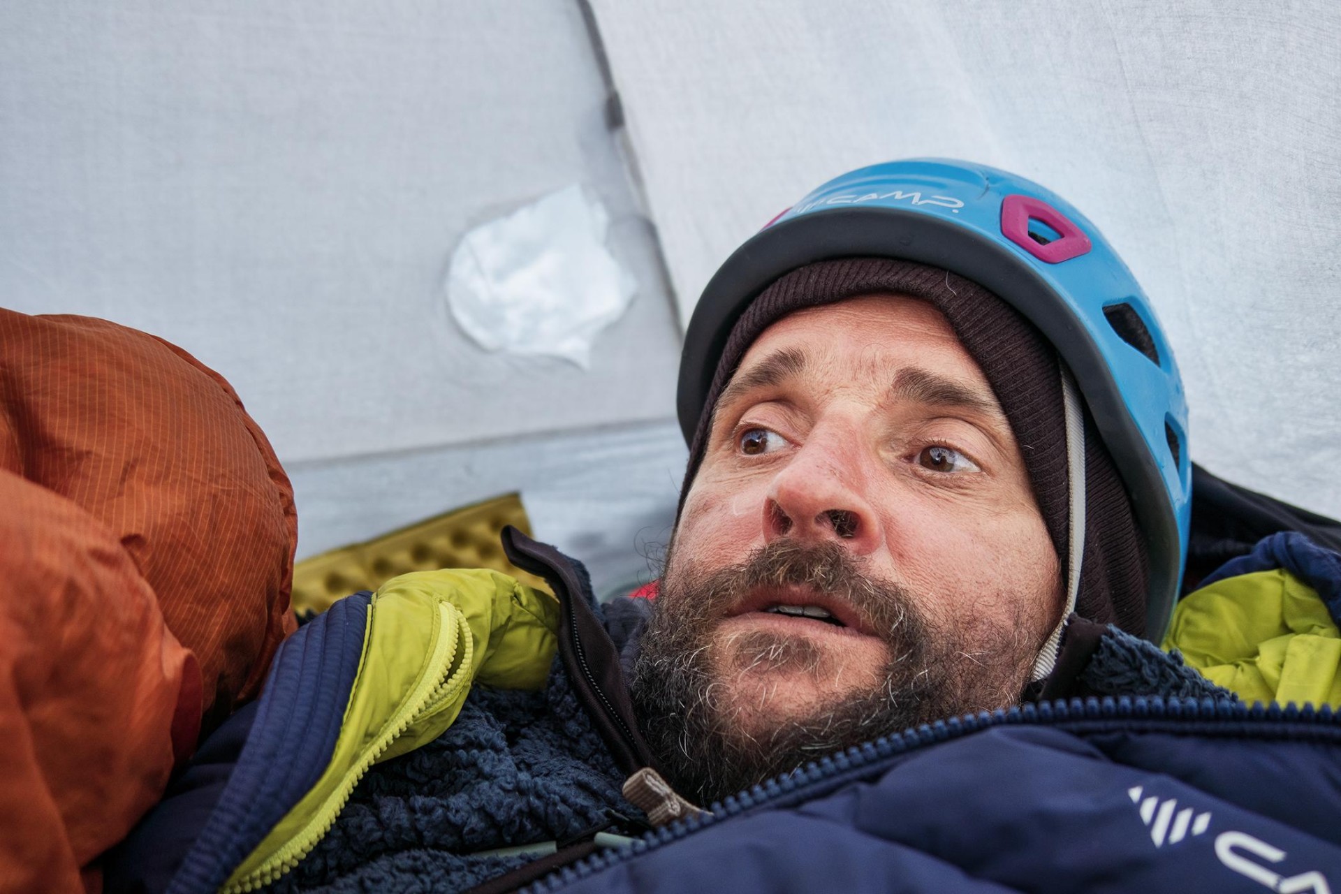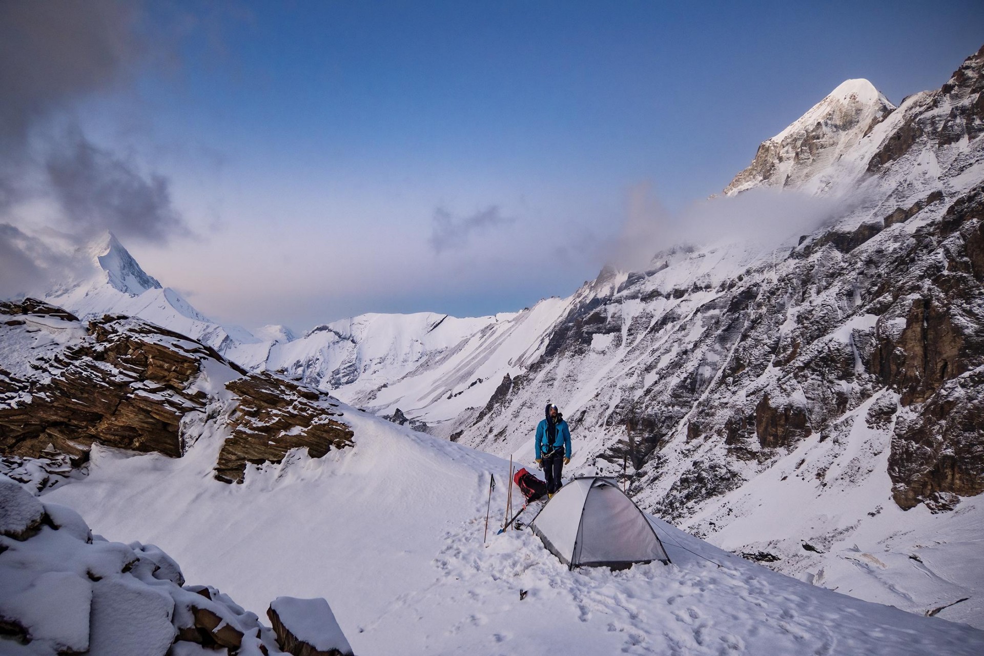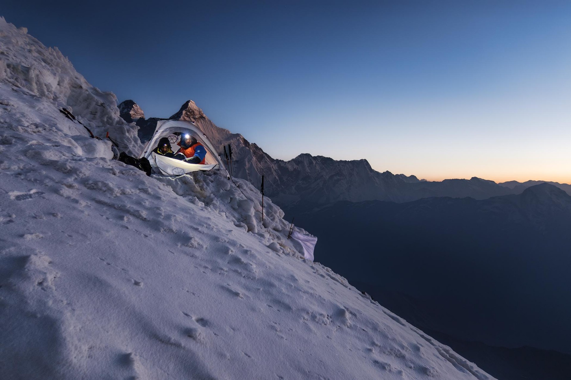 Bivakiranje med vzponom na še nedosežen šesttisočak južno od sedla Longstaff (foto Marko Prezelj)