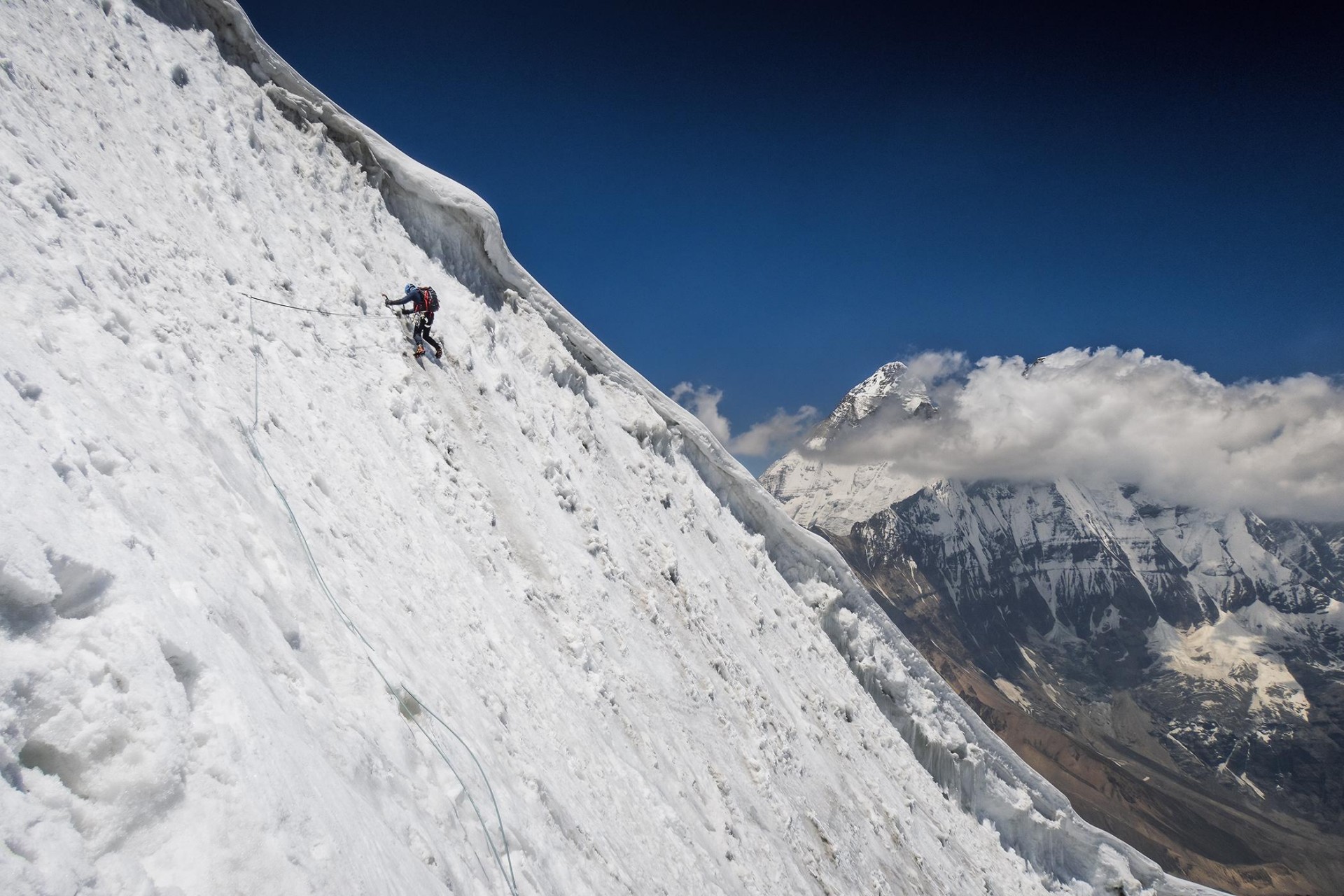 9. 6.: Vzpon z bivaka prek vstopnega lednega slapu. Opoldne začne snežiti. Bivakiramo na ozkem snežnem razu, 5700 m.