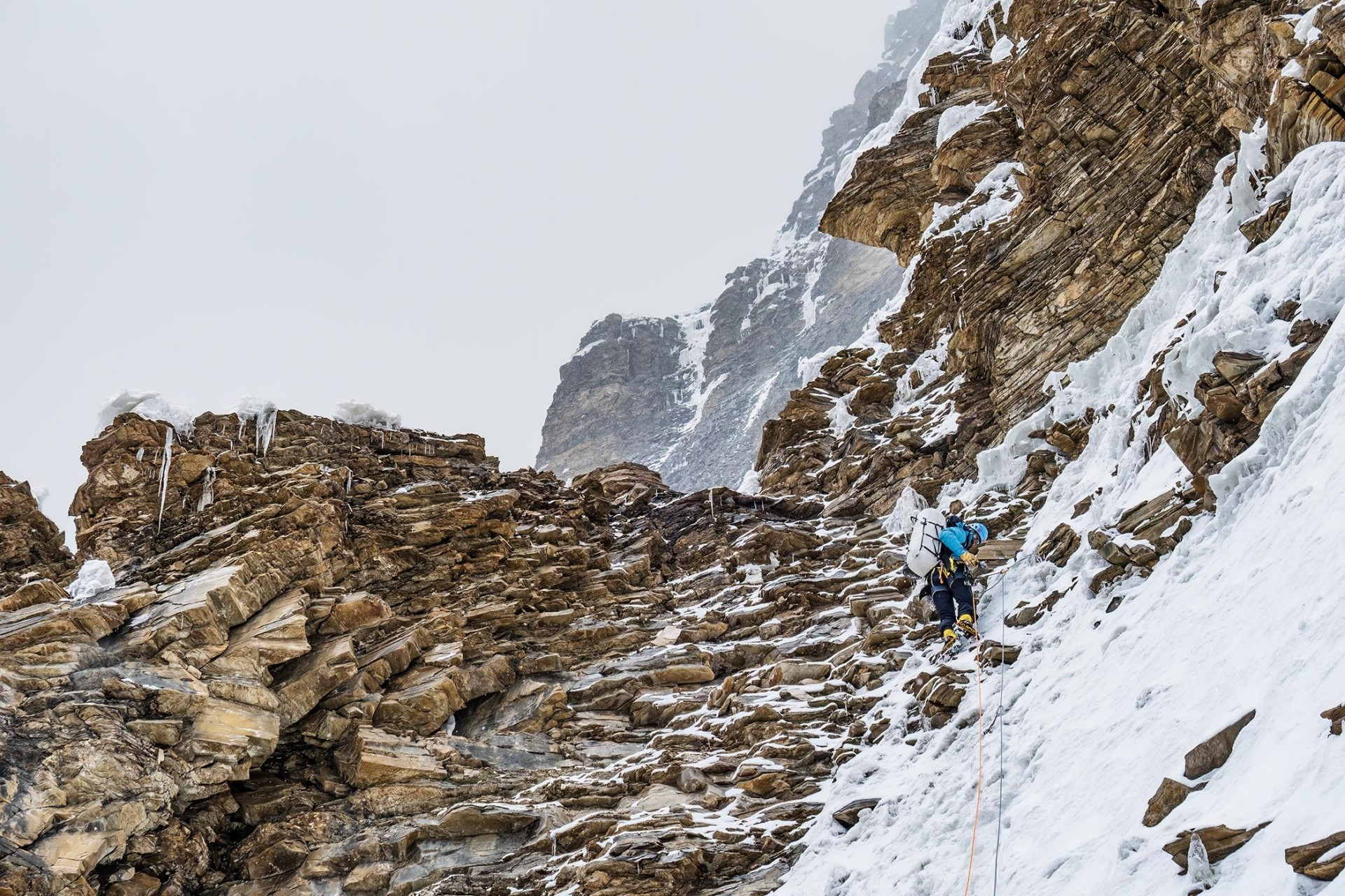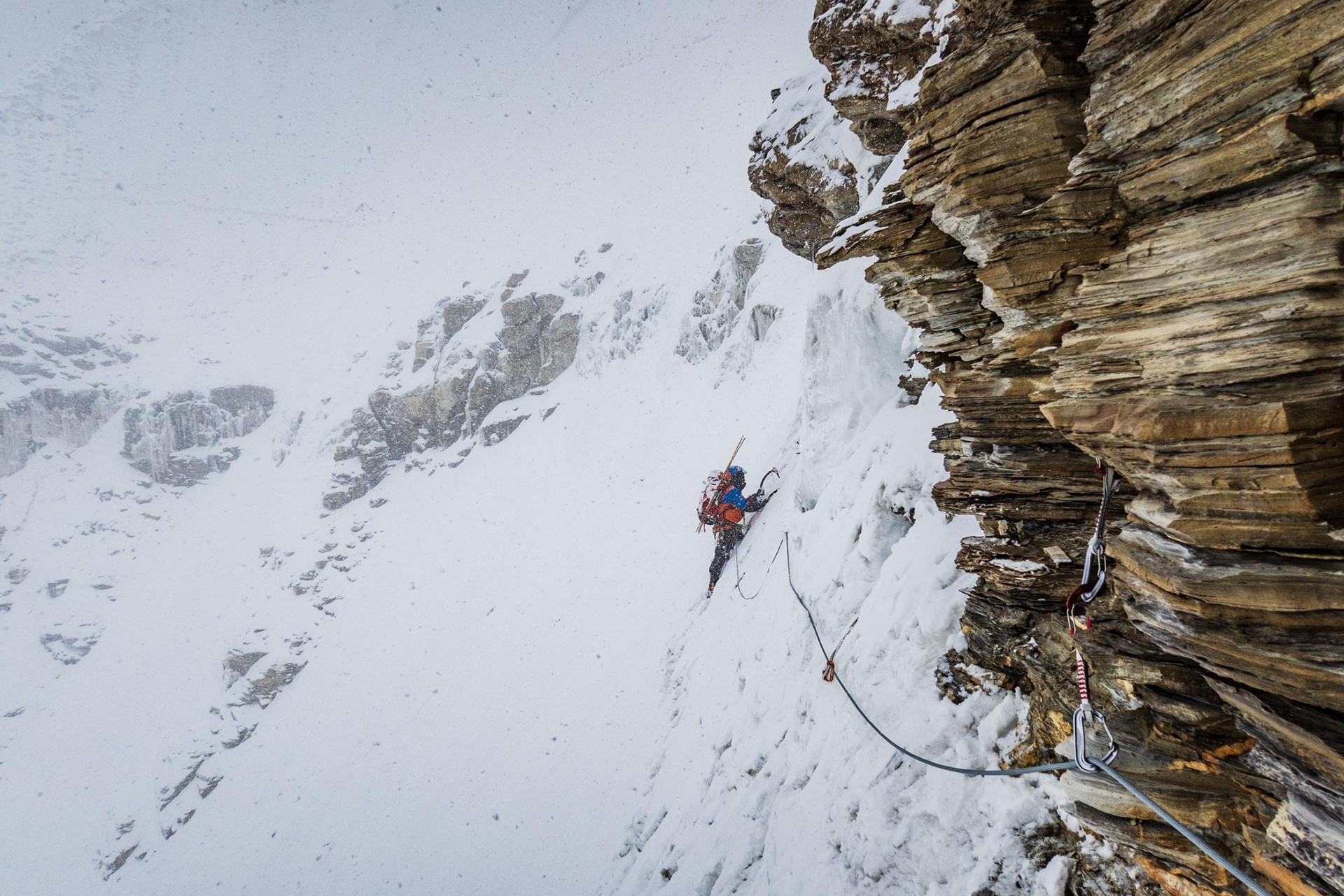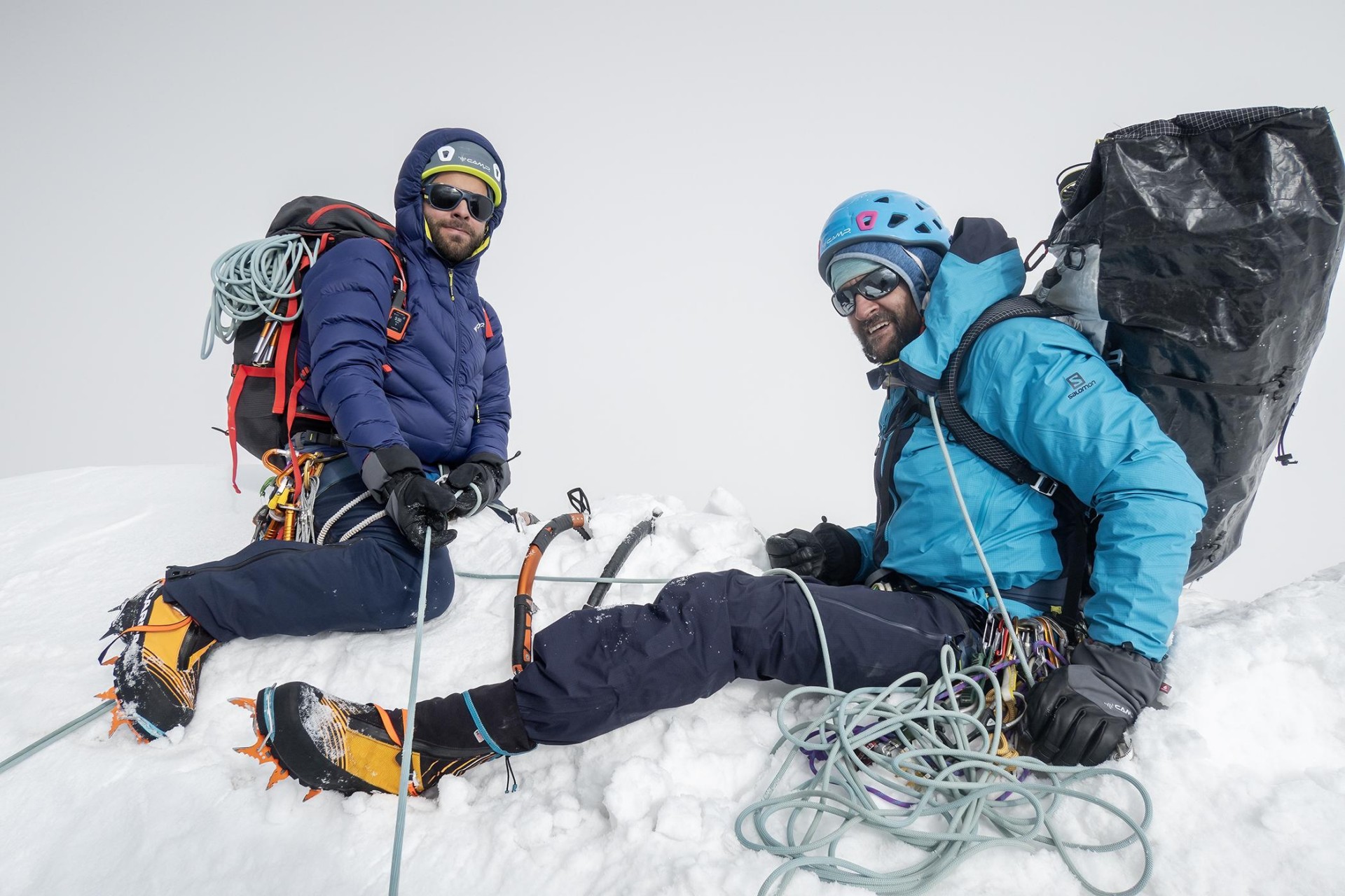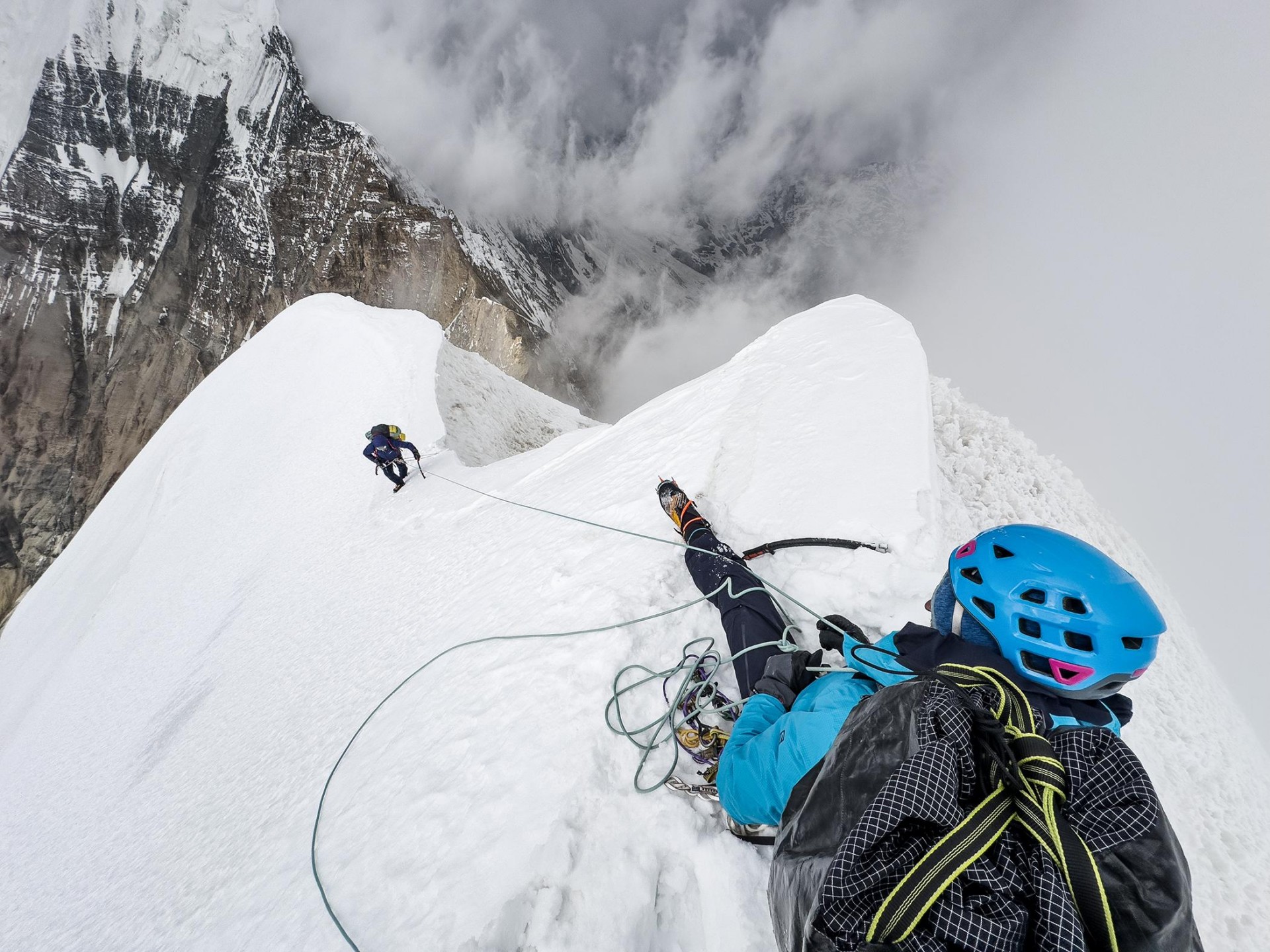 Ves ta dramatičen živalski vložek je seveda občutno vplival na naše plezanje. Zjutraj smo s čakanjem zapravili najbolj dragocen čas, ko je imel sneg še nekaj skorje, kar bi pomenilo precejšen prihranek energije, ki je šla posledično v utrujajoče gaženje. Poleg tega smo se ves čas umikali padajočemu kamenju in plezali izven idealne linije vzpona. Prvotno smo se nadejali, da bomo sredi dopoldneva dosegli greben, po katerem so na vrh splezali prvopristopniki. Na grebenu smo se znašli šele okrog enih popoldne in z vprašanji drug drugemu merili dvome v smiselnost nadaljevanja. Vsi smo porabili več energije, kot smo pričakovali, nadaljevanje po razu pa je bilo strmo in ledeno. Čeprav so nas z juga zagrinjali nevihtni oblaki, je prevladalo mnenje, da je svetlega dela dneva še dovolj in velja poskusiti splezati zadnjih tristo višinskih metrov. Res, ko sem izgovoril tristo metrov, sem nehote pomislil, da je doma to lagoden enourni vzpon. Po strmem in ledenem razu je šlo sprva počasi, ker je bil led krhek, izpostavljenost pa občutna. Po treh raztežajih se je teren nekoliko položil, sneženje pa je naš razgled omejilo na nekaj metrov. Ko smo priplezali na raz, je bilo videti, da je vrh blizu, med sneženjem pa se je za vsakim navideznim vrhom pojavila nova strmina, ki je izginjala v mlečno belino. Zadnja ura vzpona je bila zato dolga. Na vrh smo stopili ob petih popoldne ob močnem sneženju. Sestopali smo s spusti po vrvi. Dvakrat smo za spust skopali snežno gobo, ker druge možnosti ni bilo. Nižje v ozebniku pa smo se pretežno spuščali na sistem Abalakov. Po dvajsetih dolgih spustih smo malo čez polnoč dosegli bivak. Jaz sem v trenutku zaspal, Manu, ki je prevzel odgovornost za sestop, pa se je še nekaj časa pogovarjal z namišljenimi obiskovalci. Osemnajsturna osredotočenost in utrujenost ga je zavedla v haluciniranje.